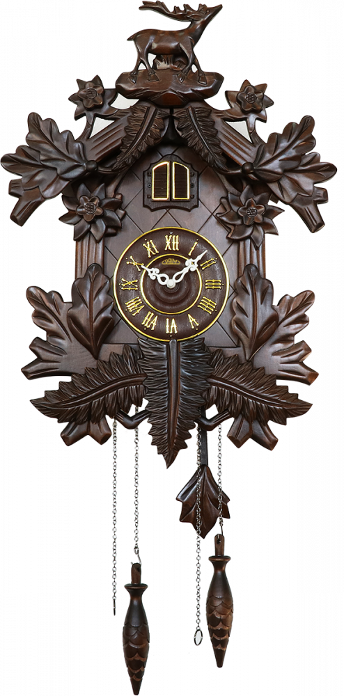 Ručně vyřezávané dřevěné kukačky. Jako základ pro skříň posloužilo lipové dřevo precizně opracované do loveckých motivů. Dřevěné je také kyvadlo a závaží ve tvaru šišek slouží jako dekorace, pohon totiž zajišťuje quartzový strojek na baterie. Zdobené bílé ručičky jsou dostatečně kontrastní k hnědému číselníku s imitací dřeva. Každou celou hodinu Vás bude malá kukačka svým kukáním informovat o čase 1-12x, podle počtu hodin. Kukačka je také na elektrický pohon a kromě kukání jsou v pozadí slyšet zvuky lesa. Elektronicky je možné regulovat hlasitost zvuků a z nočního rušení také nemusíte mít obavy. Světelný senzor rozezná intenzitu světla a v noci vypíná funkci kukání tu lze samozřejmě vypnout i manuálně.