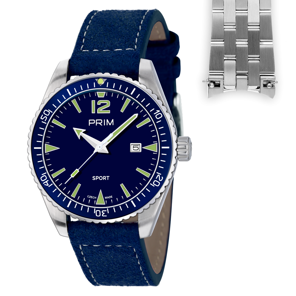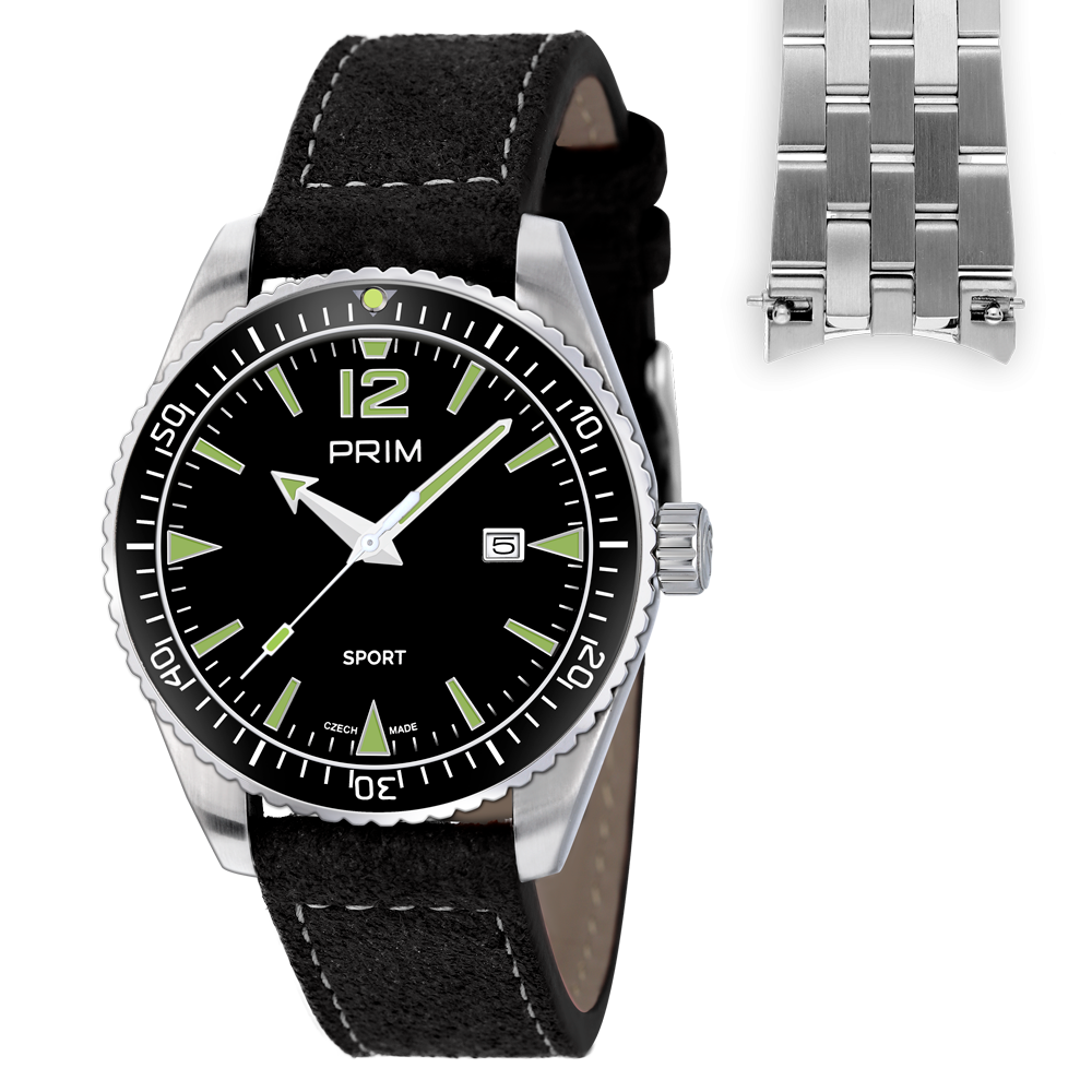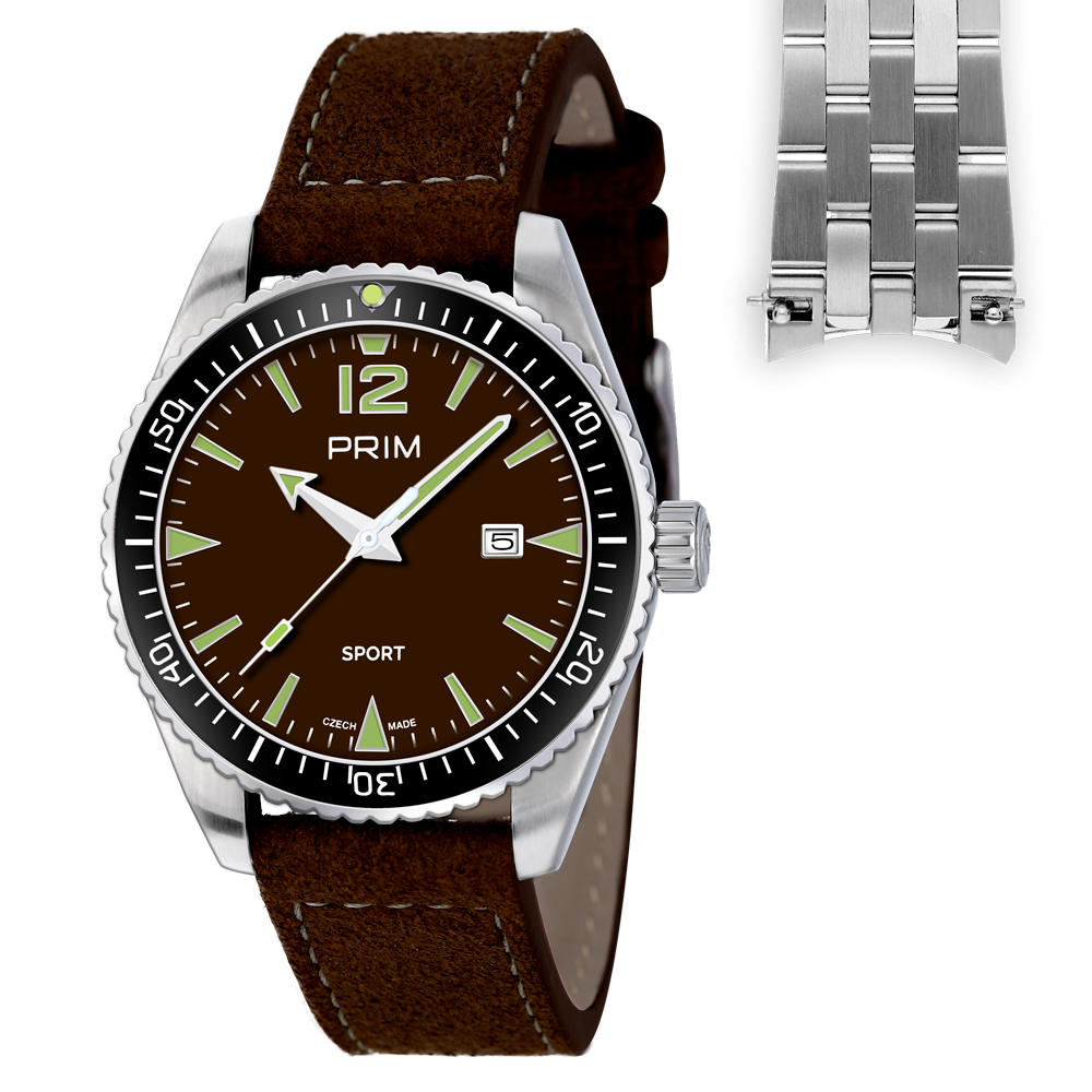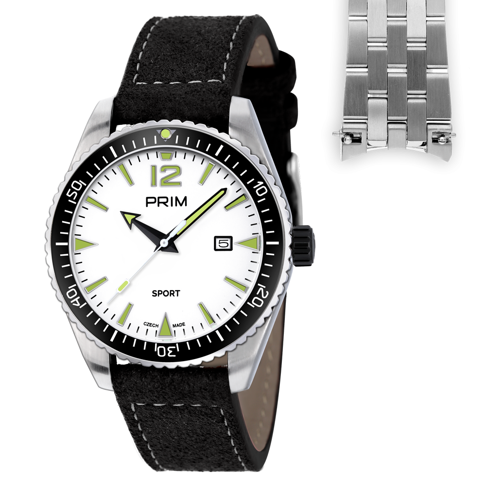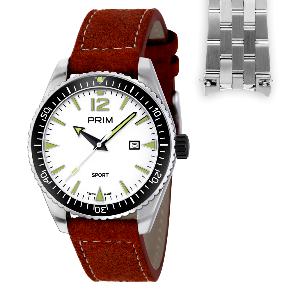 Nová edice úspěšného modelu PRIM Sport Legenda v sadě s impregnovaným koženým a nerezovým řemínkem.  Sportovní hodinky by nebyly sportovní bez většího označení voděodolnosti, to model PRIM SPORT Legenda splňuje na jedničku, a to díky 10 ATM, která zaručuje vysokou odolnost a kvalitu.