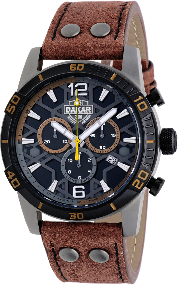 Multifunkční hodinky s chronografem jsou vyrobené z broušené ušlechtilé nerezové oceli 316 L a následně upravené metodou IPB v nové matné šedé barvě. Do pouzdra je vsazen švýcarský quartzový strojek s chronografem kalibr Ronda 5030.D. Hodinky mají dno z leštěné ušlechtilé nerezové oceli s originálním erbem a mottem „Dream, Dare, Live It“. Zapracovali jsme také na vyšší voděodolnosti 10 ATM a vyvinuli pouzdro s novou šroubovací korunkou, ta zaručuje odolnost proti vodě, což závodníci otestují v extrémních podmínkách.Pod odolným antireflexním safírovým sklíčkem je umístěn propracovaný detailní vrstvený číselník a čítače chronografu se vzorem kruhů. Nově navržená žlutá ručka chronografu je doplněna hlavními luminiscenčními hodinovými ručkami. Nový sportovní vzhled hodinkám dodává černý kroužek s CNC rytím minut v hnědé barvě. Délka měření je znázorněna v čítači na pozici 9 hodin (měření do 30 minut). V číselníku na pozici 4 hodiny se nachází okénko, ve kterém je zobrazeno datum.
