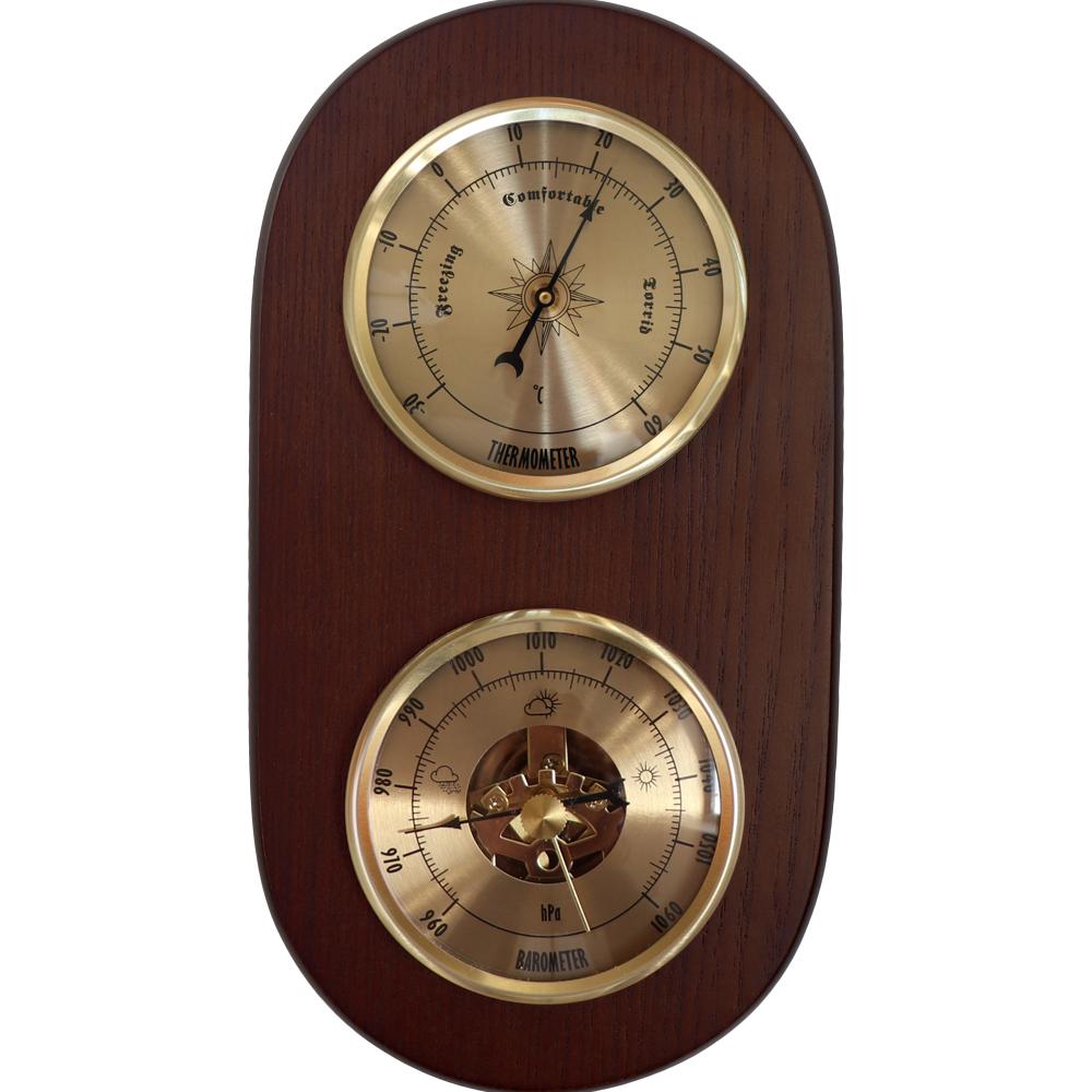 Nástěnná analogová meteostanice s teploměrem a barometrem.