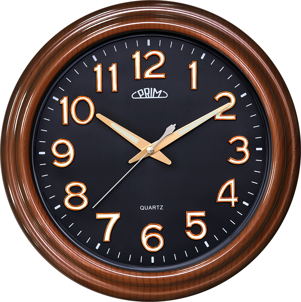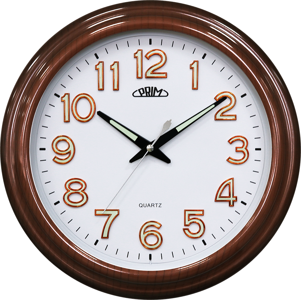 Nástěnné kulaté PRIM hodiny s ručičkami a číslicemi svítícími ve tmě. Hodiny mají tichý a plynulý chod.