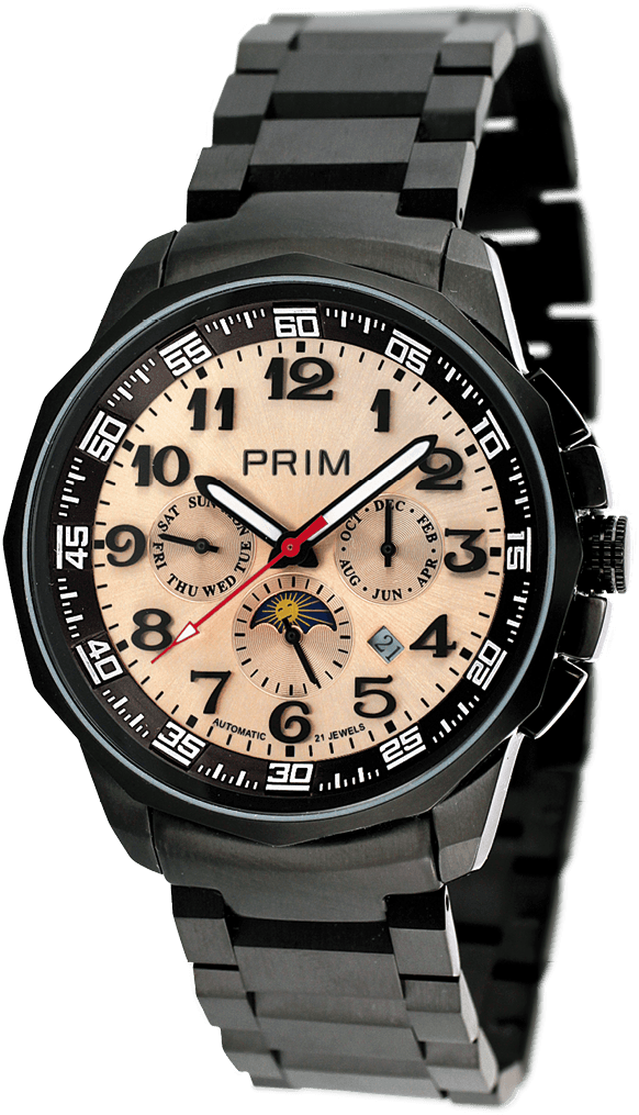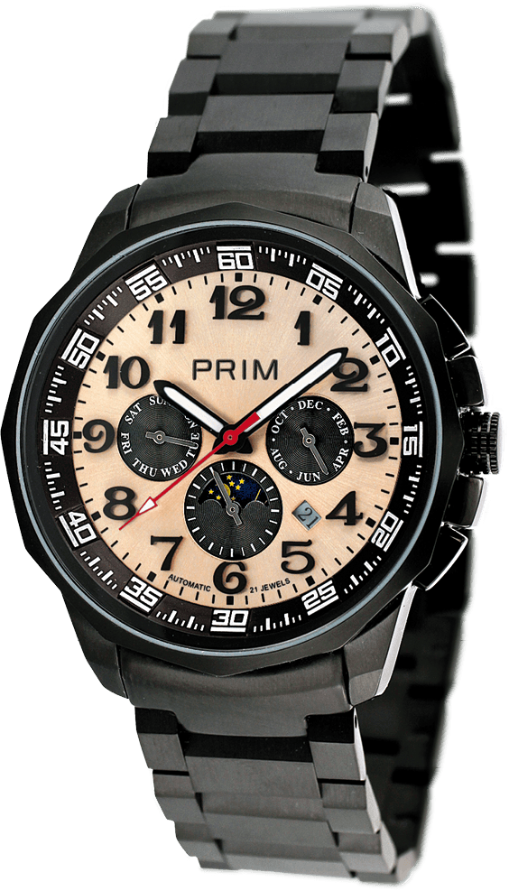 Multifunkční automat je vyroben z kartáčované ušlechtilé nerezové oceli 316 L, povrchově upravené technologií IPB. Tato otěru odolná úprava dává pouzdru černý odstín. Do pouzdra je vsazen multifunkční strojek automat kalibr 2869 s možností natáhnout ocelovou korunkou. Hodinky mají dno z ušlechtilé nerezové oceli uzavřené na závit s průzorem na pracující strojek. Vodotěsnost 5 ATM zaručuje odolnost proti vlhku při běžném použití. Pod konvexním minerálním sklíčkem je reliéfní číselník s vystouplými arabskými čísly a na jeho kroužku je zobrazena minutová stupnice. Číselník má také okénko na pozici 4:30 hod ve kterém je datum. Hlavní hodinová a minutová ručka jsou pokryty luminiscenční vrstvou. Měsíc ukazuje lakovaná ručka na pozici 3 hod., den v týdnu na pozici 9 hod. Na pozici 6 hod. je číselník s 24 hodinovým formátem času a zároveň se zobrazením denní fáze dne a noci. Náramek je upraven kartáčováním a leštěním rovněž vyroben z ušlechtilé oceli 316 L a upraven technologií IPB. Zapínání náramku je se sponou motýlek. Tyto hodinky jsou dodávány v luxusní krabičce se záručním listem a návodem.
