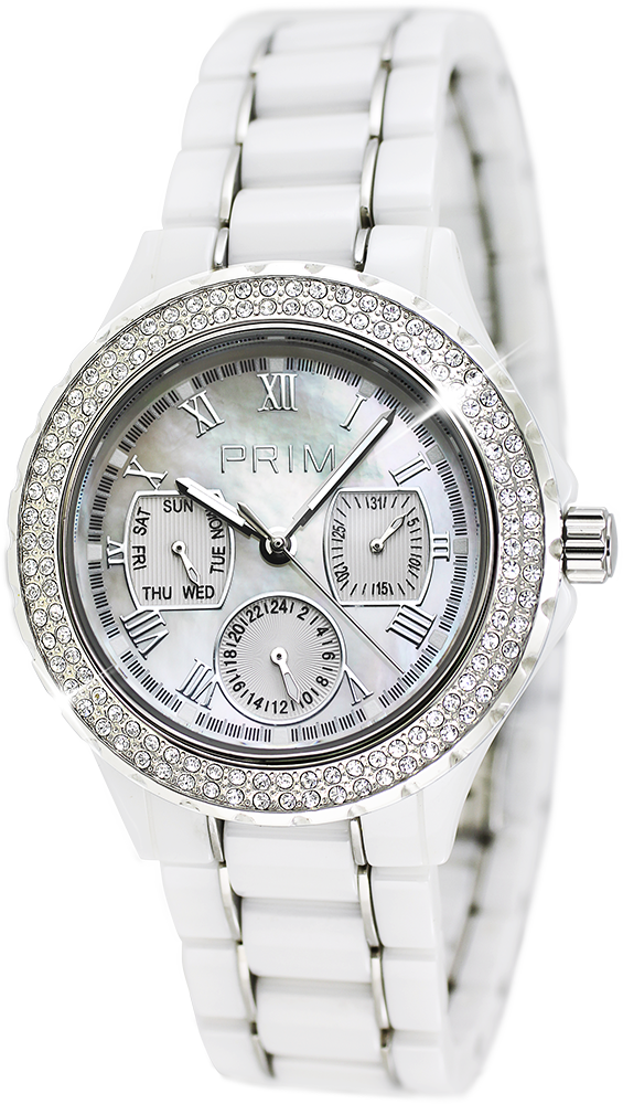 Dámské keramické multifunkční hodinky. Do bílého keramického pouzdra s průměrem 40 mm je použit quartzový strojek kalibr 6P29. Dno je z ušlechtilé nerezové oceli 316L uzavřené čtveřicí šroubků. Vodotěsnost 5 ATM zaručuje odolnost proti vodě při běžném použití. V otočném kroužku s jednosměrnou aretací je vsazeno přes 120 krystalů Swarovski. Pod minerálním sklíčkem byl použit číselník z pravé přírodní perleti měnící odstín dle dopadu světla. V čítači na pozici 3 hod. je umístěn datum. Den v týdnu a 24 hodinový duální čas, jsou umístěny v čítačích na pozici 9 resp. 6 hodin . Luminiscenční vrstvou jsou pokryty, jak hlavní hodinové ručky, tak i ručky čítačů. Náramek je vyroben rovněž z keramiky zpevněn ocelovými prvky. Spona tzv. motýlek dává vyniknout keramickému náramku. Tyto hodinky jsou dodávány v luxusní krabičce se záručním listem a návodem.