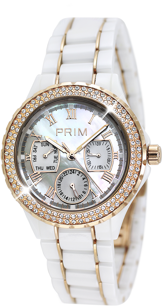 Dámské keramické multifunkční hodinky. Do bílého keramického pouzdra s průměrem 40 mm je použit quartzový strojek kalibr 6P29. Dno je z ušlechtilé nerezové oceli 316L uzavřené čtveřicí šroubků. Vodotěsnost 5 ATM zaručuje odolnost proti vodě při běžném použití. V otočném kroužku s jednosměrnou aretací je vsazeno přes 120 krystalů Swarovski, kroužek je navíc upraven technologií IPGR dodávající odstín růžového zlacení. Pod minerálním sklíčkem byl použit číselník z pravé přírodní perleti měnící odstín dle dopadu světla. V čítači na pozici 3 hod. je umístěn datum. Den v týdnu a 24 hodinový duální čas, jsou umístěny v čítačích na pozici 9 resp. 6 hodin . Luminiscenční vrstvou jsou pokryty, jak hlavní růžově zlacené hodinové ručky, tak i ručky čítačů. Náramek je vyroben rovněž z keramiky zpevněn ocelovými prvky. Spona tzv. motýlek dává vyniknout keramickému náramku. Tyto hodinky jsou dodávány v luxusní krabičce se záručním listem a návodem.