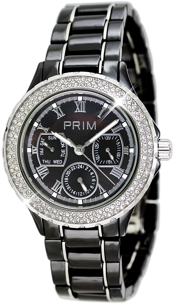 Dámské keramické multifunkční hodinky. Do černého keramického pouzdra s průměrem 40 mm je použit quartzový strojek kalibr 6P29. Dno je z ušlechtilé nerezové oceli 316L uzavřené čtveřicí šroubků. Vodotěsnost 5 ATM zaručuje odolnost proti vodě při běžném použití. V otočném kroužku s jednosměrnou aretací je vsazeno přes 120 krystalů Swarovski. Pod minerálním sklíčkem byl použit číselník z pravé přírodní perleti měnící odstín dle dopadu světla. V čítači na pozici 3 hod. je umístěn datum. Den v týdnu a 24 hodinový duální čas, jsou umístěny v čítačích na pozici 9 resp. 6 hodin . Luminiscenční vrstvou jsou pokryty, jak hlavní hodinové ručky, tak i ručky čítačů. Náramek je vyroben rovněž z keramiky zpevněn ocelovými prvky. Spona tzv. motýlek dává vyniknout keramickému náramku. Tyto hodinky jsou dodávány v luxusní krabičce se záručním listem a návodem.