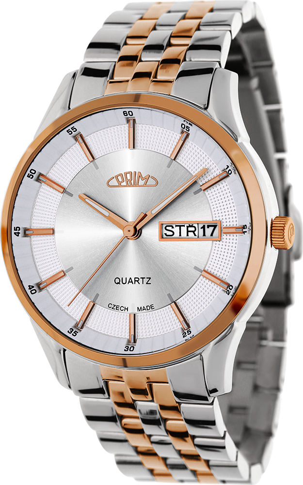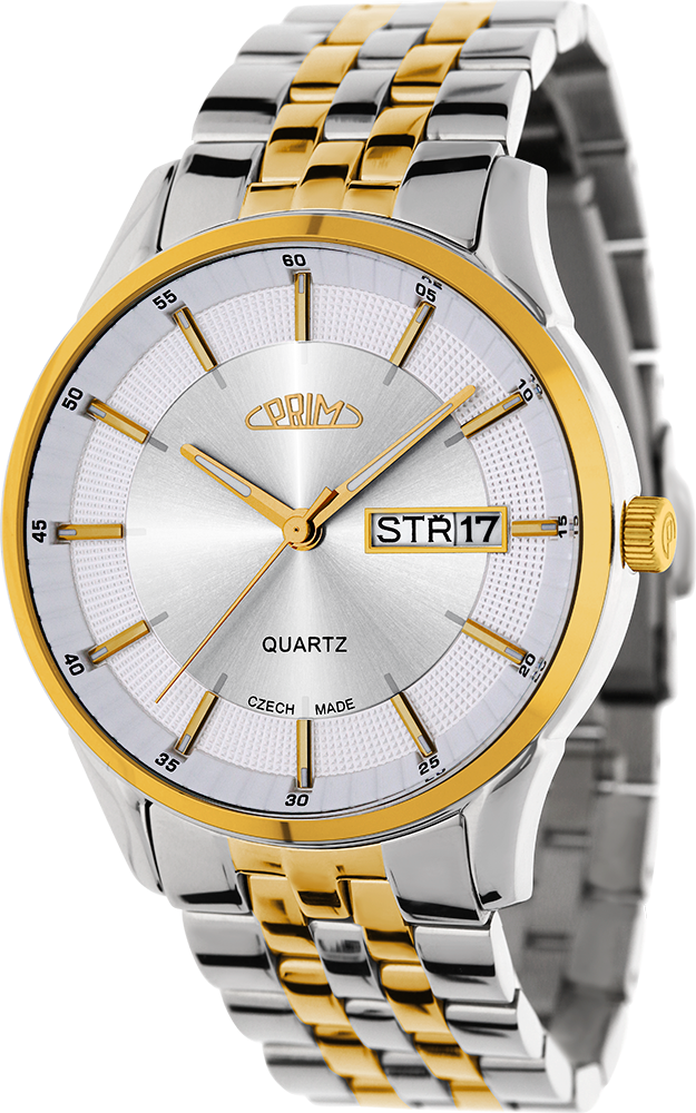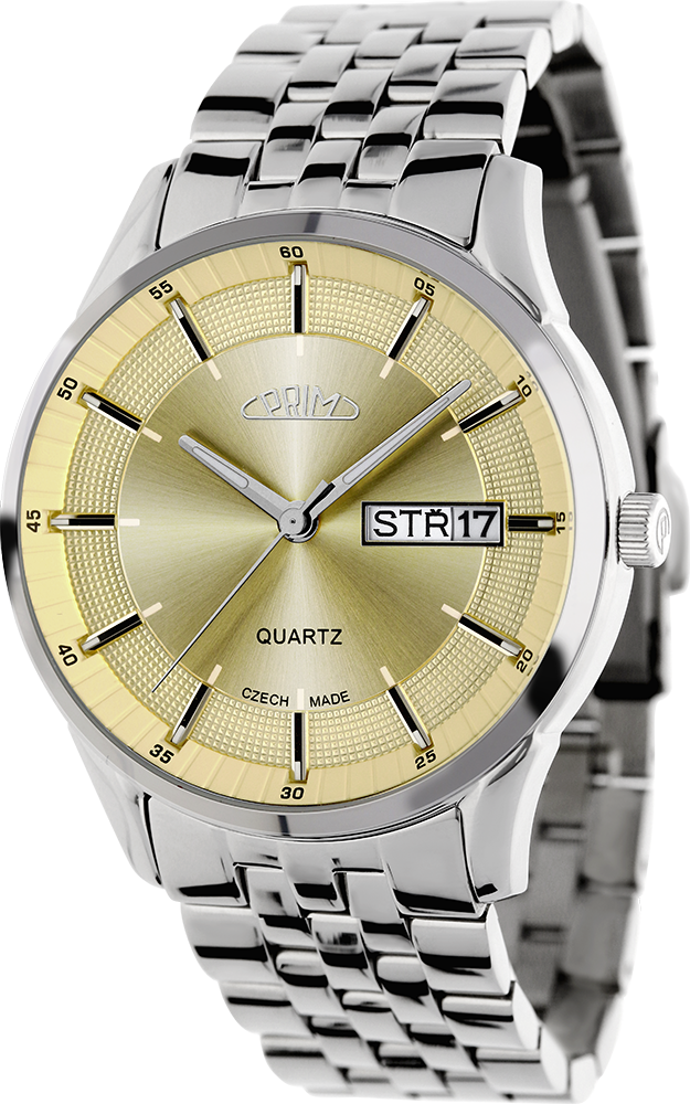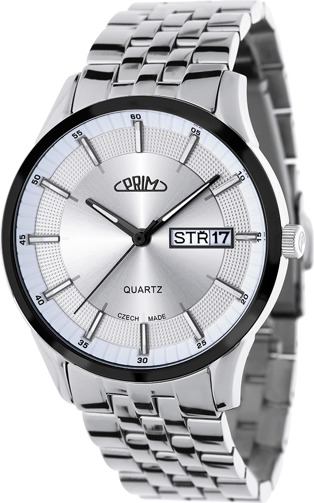 Klasické společenské hodinky PRIM Klasik 61 CZ vyrobeny z kartáčované ušlechtilé oceli 316 L. Hodinky mají elegantně propracované pouzdro s decentní korunkou s logem P. Do pouzdra je vsazen quartzový strojek Miyota 2305. Hodinky mají dno z ušlechtilé nerezové oceli s popisem hodinek. Voděodolnost 5 ATM zaručuje odolnost proti vlhku při běžném použití. Pod kvalitním minerálním sklíčkem se nachází propracovaný reliéfní číselník s plastickými indexy a na jeho vnějším okraji je zobrazena minutová stupnice. Číselník má také okénko na pozici 3 hod, ve kterém je umístěno datum a den v týdnu v českém jazyce. Samožrejmostí jsou lumini ručičky. Kvalitní nerezový řemínek s klasickou sponou dodává hodinkám společenský vzhled. Tyto hodinky jsou dodávány v krabičce se záručním listem.