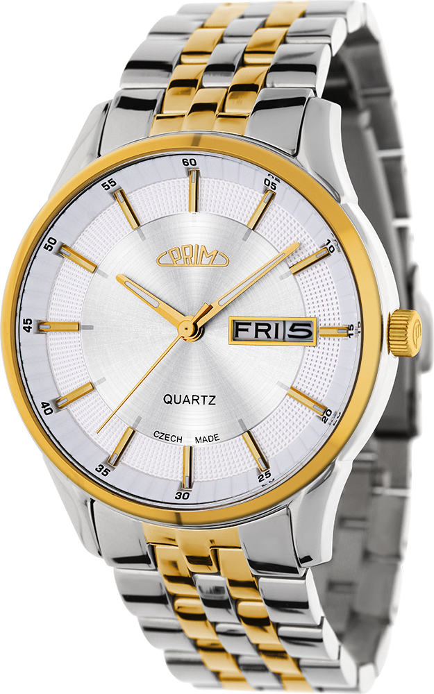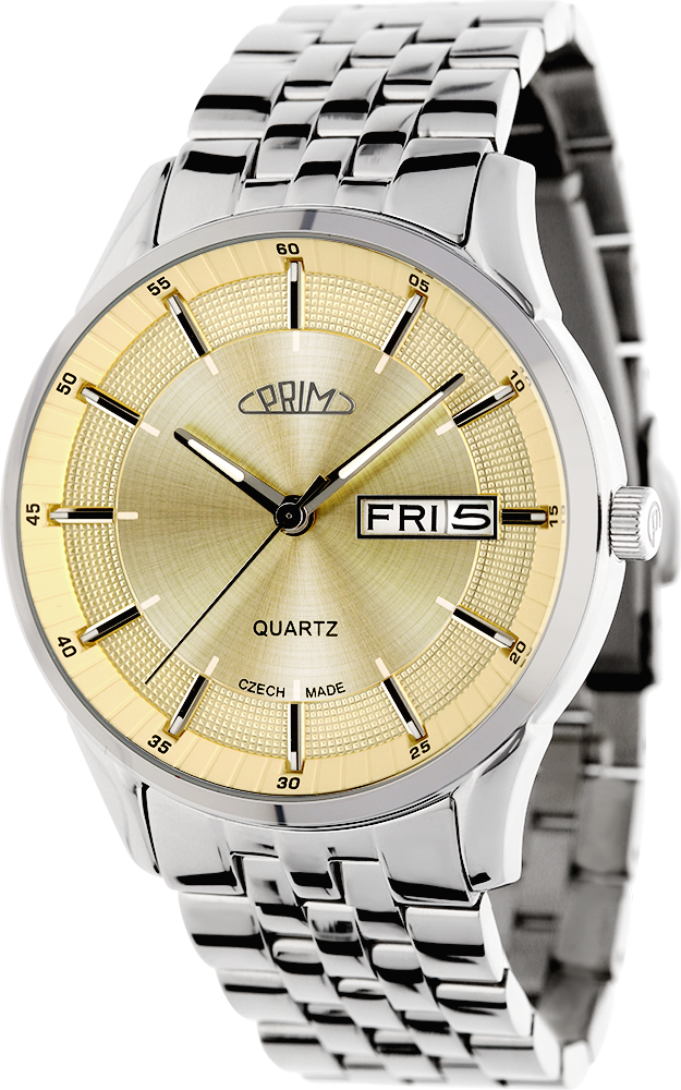 Klasické společenské hodinky PRIM Klasik 61 vyrobeny z kartáčované ušlechtilé oceli 316 L. Hodinky mají elegantně propracované pouzdro s decentní korunko s logem P. Do pouzdra je vsazen quartzový strojek Miyota 2305. Hodinky mají dno z ušlechtilé nerezové oceli s popisem hodinek. Voděodolnost 5 ATM zaručuje odolnost proti vlhku při běžném použití. Pod kvalitním minerálním sklíčkem se nachází propracovaný reliéfní číselník s plastickými indexy a na jeho vnějším okraji je zobrazena minutová stupnice. Číselník má také okénko na pozici 3 hod, ve kterém je umístěno datum a den v týdnu. Kvalitní nerezový řemínek s klasickou sponou dodává hodinkám společenský vzhled. Tyto hodinky jsou dodávány v luxusní krabičce se záručním listem.