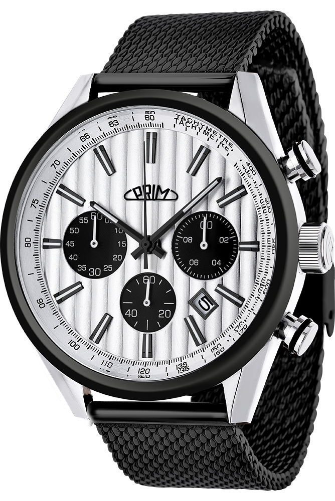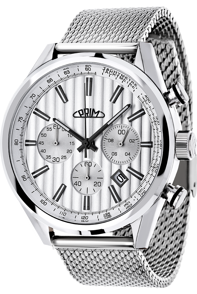Elegantní multifunkční hodinky s chronografem vyrobené v kombinaci broušené a leštěné ušlechtilé nerezové oceli 316 L. Uvnitř pracuje quartzový strojek s chronografem kalibr 6S20. S přesností měření na 1/20 vteřiny s délkou měření 59 min 59 vteřin. Vodotěsnost 5 ATM zaručuje odolnost proti vlhkosti při běžném použití. Použili jsme propracovaný moderní ciferník s ženevskými pruhy. Čas ukazují ručky s luminiscenční vrstvou, kterou jsou opatřeny i reliéfní indexy, usnadňující odpočet času za snížených světelných podmínek. Specialitou je také její chod nepohybuje se po jedné vteřině jak je tomu u běžných quartzových strojků, její krok je 1/4 vteřiny, takže vytváří dojem jako je tomu u mechanických hodinek. Hodinky jsou opatřeny moderním mesh řemínkem v barvě pouzdra.