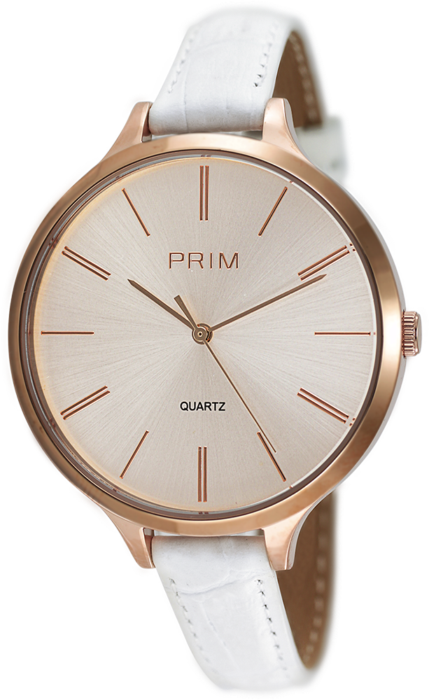 Elegantní dámské hodinky PRIM s quartzovým strojkem ocelovým pouzdrem na moderním koženém řemínku. Pouzdro je následně upraveno technologií IPGR, tato otěru odolná úprava dává hodinkám odstín růžového zlata. Do tohoto modelu je vsazen kalibr Miyota 2035 a je uzavřen dnem z ušlechtilé nerezové oceli 316L. Vodotěsnost 5 ATM zaručuje odolnost proti vodě při běžném použití. Pod minerálním sklem je číselník s vystouplými indexy, čas ukazují stříbrné ručky. Velmi jemný řemínek je zakončen klasickou sponou. Tyto hodinky jsou dodávány v krabičce se záručním listem a návodem.