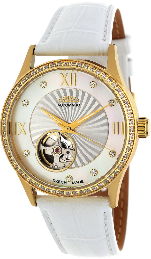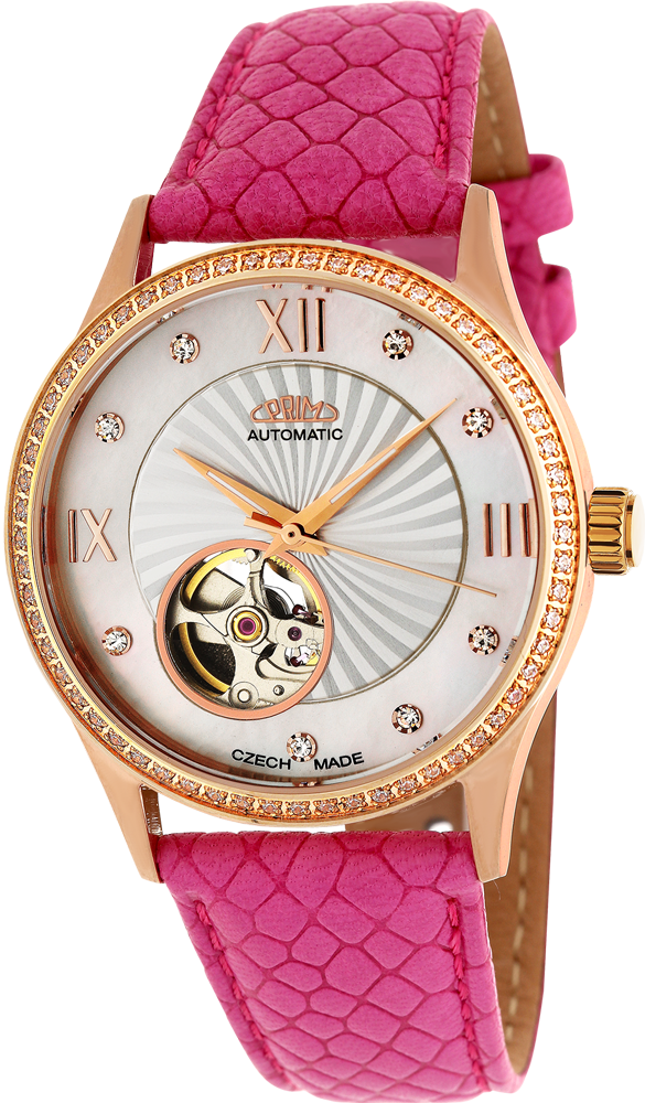 Elegantní dámský automat vyroben z leštěné ušlechtilé nerezové oceli 316 L. Do pouzdra je vsazen strojek automat 82S0 s možností natáhnutí ocelovou korunkou. Do pouzdra jsou po obvodu vsazeny metodou CNC krystaly. Hodinky jsou uzavřeny na závit dnem z ušlechtilé nerezové oceli 316L s průzorem na pracující strojek. Vodotěsnost 5 ATM zaručuje odolnost proti vlhku při běžném použití. Pod minerálním sklíčkem se nachází elegantní reliéfní číselník s kombinací perletě, římské indexy s krystaly. Číselník má také průzor na pozici 7 hod. Čas ukazují leštěné ručky pokryté luminiscenční vrstvou pro lepší viditelnost v tmavých prostorech. Model má kvalitní moderní a prošitý kožený řemínek s klasickou sponou. Tyto hodinky jsou dodávány v luxusní krabičce se záručním listem a návodem.