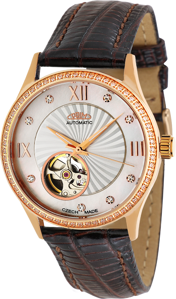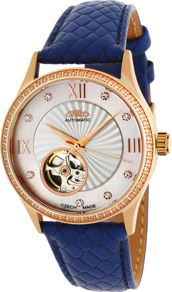 Elegantní dámský automat vyroben z leštěné ušlechtilé nerezové oceli 316 L. Do pouzdra je vsazen strojek automat 82S0 s možností natáhnutí ocelovou korunkou. Do pouzdra jsou po obvodu vsazeny metodou CNC krystaly Swarowski. Hodinky jsou uzavřeny na závit dnem z ušlechtilé nerezové oceli 316L s průzorem na pracující strojek. Vodotěsnost 5 ATM zaručuje odolnost proti vlhku při běžném použití. Pod minerálním sklíčkem se nachází elegantní reliéfní číselník s kombinací perletě, římské indexy s krystaly. Číselník má také průzor na pozici 7 hod. Čas ukazují leštěné ručky pokryté luminiscenční vrstvou pro lepší viditelnost v tmavých prostorech. Model má kvalitní moderní a prošitý kožený řemínek s klasickou sponou. Tyto hodinky jsou dodávány v luxusní krabičce se záručním listem a návodem.