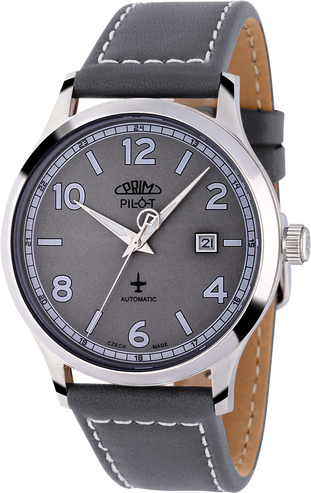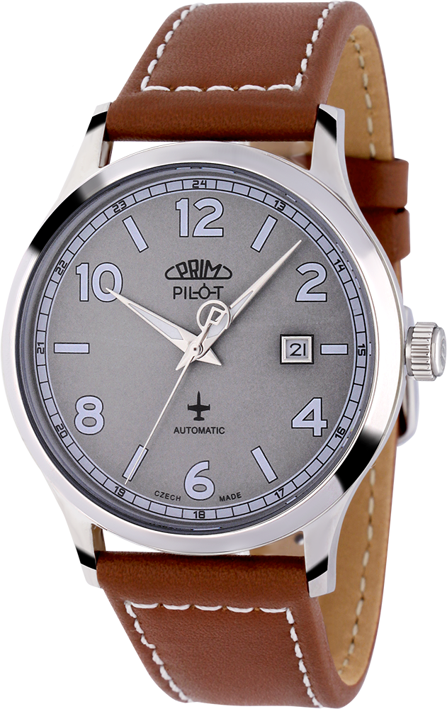 Pánské hodinky PRIM Pilot Automatic české značky v sobě kombinují vysokou kvalitu použitých materiálů a originální design pilotních hodinek, na kterém pracovalo naše studio 4 měsíce. Vzniklo tak stylové pouzdro hodinek z kvalitní ušlechtilé nerezové oceli 316L (ve stříbrné nebo černé PVD barvě), uzavřené nerezovým víčkem s průzorem. Detailně promyšlený ciferník s dobře čitelnými arabskými číslicemi ve světlých barvách je chráněn kvalitním safírovým sklem. Zvolili jsme retro styl populárních pilotních hodinek a na ciferník umístili symbol českého letadla Albatros L39 a originálně zvolený nápis PILOT s ukazatelem příčného sklonoměru. Hodinky jsme oživili originální sekundovou ručkou s decentním logem – ikona písmene P přecházející do kruhového oblouku, který představuje plynutí času. Propracovanou korunku zdobí decentní logo značky PRIM. Voděodolnost 5 ATM zaručuje odolnost proti vlhku při běžném užití. Na pozici 3 hodiny je vytvořeno okénko pro zobrazení datumu. Použili jsme osvědčený kalibr automat 8215, který v sobě skrývá 21 rubínů. Kvalitní prošitý retro kožený řemínek je zakončen designovou ocelovou sponou na trn.