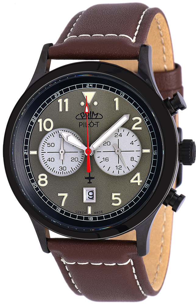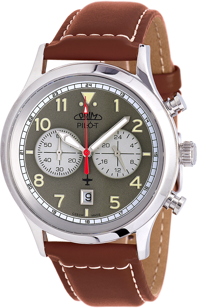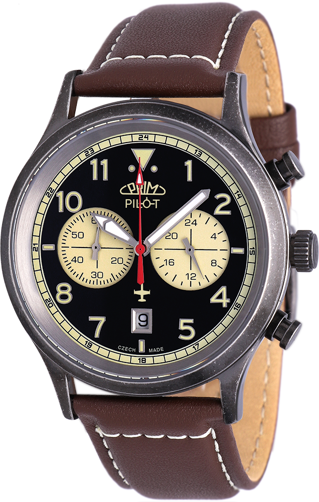Pánské hodinky PRIM Pilot Chronograph české značky v sobě kombinují vysokou kvalitu použitých materiálů a originální design. Pouzdro hodinek je vyrobené z té nejkvalitnější ušlechtilé oceli 316L (ve stříbrné, černé PVD a nově IP antické stříbrné barvě) a nově jsou hodinky s safírovým antireflexním sklíčkem. Designéři navrhli nový, detailně promyšlený ciferník s vystouplými čitelnými indexy a také doplnili symbolickým trojúhelníkem s tečkami, který neodmyslitelně k modelu PILOT patří. Pravému znalci neunikne silueta legendárního československého cvičného letounu Albatros L-39, který působí dojmem, jako by se zrovna chystal proletět mezi chronografy. Nechybí ani tradiční nápis PILOT s ukazatelem příčného sklonoměru. Hodinky jsme oživili novou originální pilotní ručkou s luminiscenční vrstvou. Dva výrazné chronografy poslouží funkcí stopek a 24 hodinového času. Nad pozici 6 hodiny je umístěno datum. Použili jsme osvědčený kalibr chronograf OS21. Kvalitní prošívaný retro kožený řemínek je zakončen designovou ocelovou sponou na trn. Propracovanou korunku zdobí  decentní logo – ikona písmene P přecházející do kruhového oblouku, který představuje plynutí času. Voděodolnost 5 ATM zaručuje odolnost proti vlhku při běžném užití.