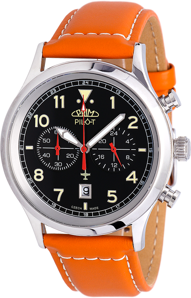 Pánské hodinky PRIM Pilot Chronograph české značky v sobě kombinují vysokou kvalitu použitých materiálů a originální design. Pouzdro hodinek je vyrobené z té nejkvalitnější ušlechtilé oceli 316L (ve stříbrné, černé PVD a nově IP antické stříbrné barvě) a nově jsou hodinky s safírovým antireflexním sklíčkem. Designéři navrhli nový, detailně promyšlený ciferník s vystouplými čitelnými indexy a také doplnili symbolickým trojúhelníkem s tečkami, který neodmyslitelně k modelu PILOT patří. Pravému znalci neunikne silueta legendárního československého cvičného letounu Albatros L-39, který působí dojmem, jako by se zrovna chystal proletět mezi chronografy. Nechybí ani tradiční nápis PILOT s ukazatelem příčného sklonoměru. Hodinky jsme oživili novou originální pilotní ručkou s luminiscenční vrstvou. Dva výrazné chronografy poslouží funkcí stopek a 24 hodinového času. Nad pozici 6 hodiny je umístěno datum. Použili jsme osvědčený kalibr chronograf OS21. Kvalitní prošívaný retro kožený řemínek je zakončen designovou ocelovou sponou na trn. Propracovanou korunku zdobí  decentní logo – ikona písmene P přecházející do kruhového oblouku, který představuje plynutí času. Voděodolnost 5 ATM zaručuje odolnost proti vlhku při běžném užití.