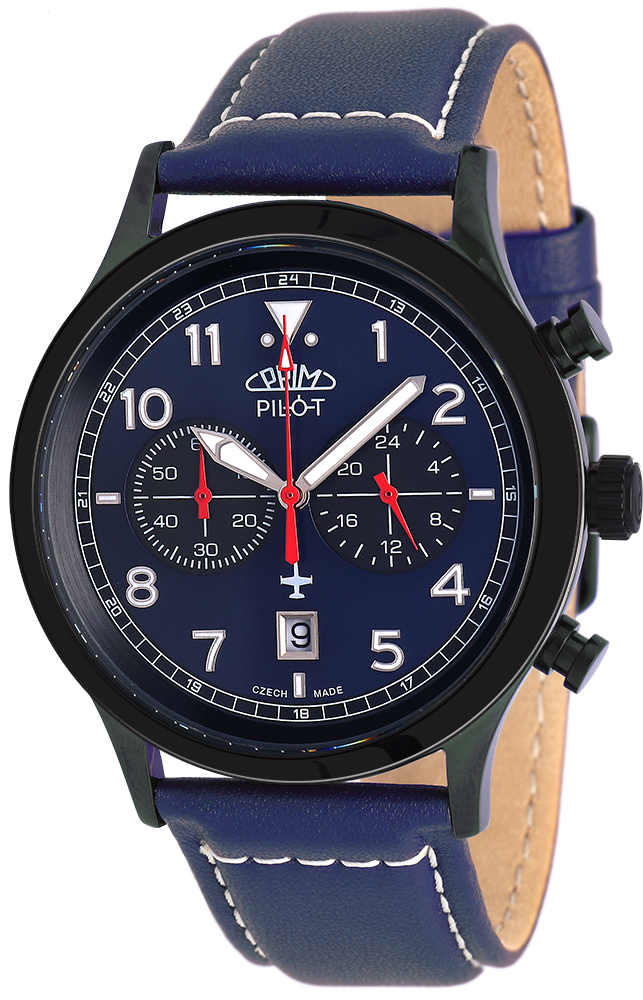 Pánské hodinky PRIM Pilot Chronograph české značky v sobě kombinují vysokou kvalitu použitých materiálů a originální design. Pouzdro hodinek je vyrobené z té nejkvalitnější ušlechtilé oceli 316L (ve stříbrné, černé PVD a nově IP antické stříbrné barvě) a nově jsou hodinky s safírovým antireflexním sklíčkem. Designéři navrhli nový, detailně promyšlený ciferník s vystouplými čitelnými indexy a také doplnili symbolickým trojúhelníkem s tečkami, který neodmyslitelně k modelu PILOT patří. Pravému znalci neunikne silueta legendárního československého cvičného letounu Albatros L-39, který působí dojmem, jako by se zrovna chystal proletět mezi chronografy. Nechybí ani tradiční nápis PILOT s ukazatelem příčného sklonoměru. Hodinky jsme oživili novou originální pilotní ručkou s luminiscenční vrstvou. Dva výrazné chronografy poslouží funkcí stopek a 24 hodinového času. Nad pozici 6 hodiny se nachází datum. Použili jsme osvědčený kalibr chronograf OS21. Kvalitní prošívaný retro kožený řemínek je zakončen designovou ocelovou sponou na trn. Propracovanou korunku zdobí  decentní logo – ikona písmene P přecházející do kruhového oblouku, který představuje plynutí času. Voděodolnost 5 ATM zaručuje odolnost proti vlhku při běžném užití.
