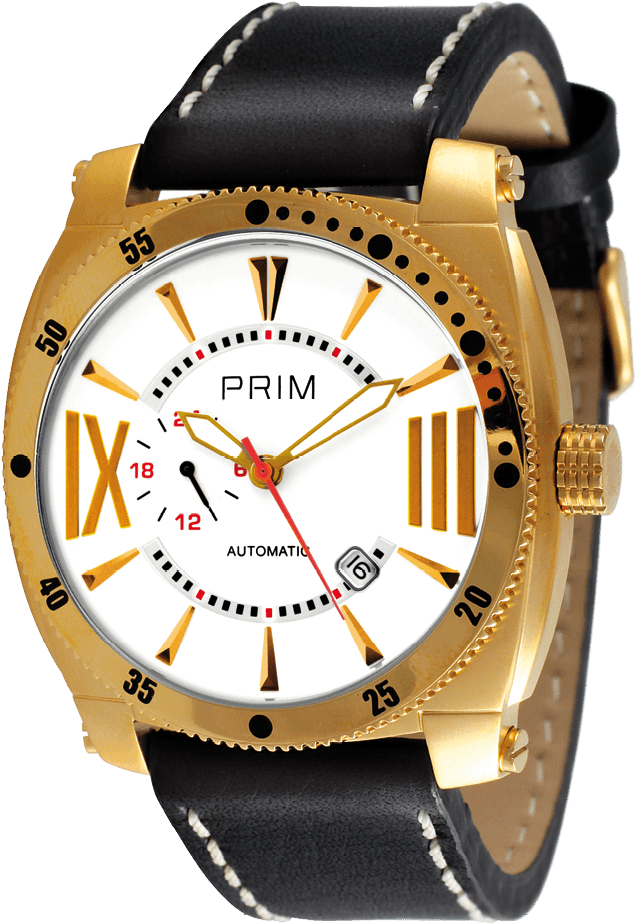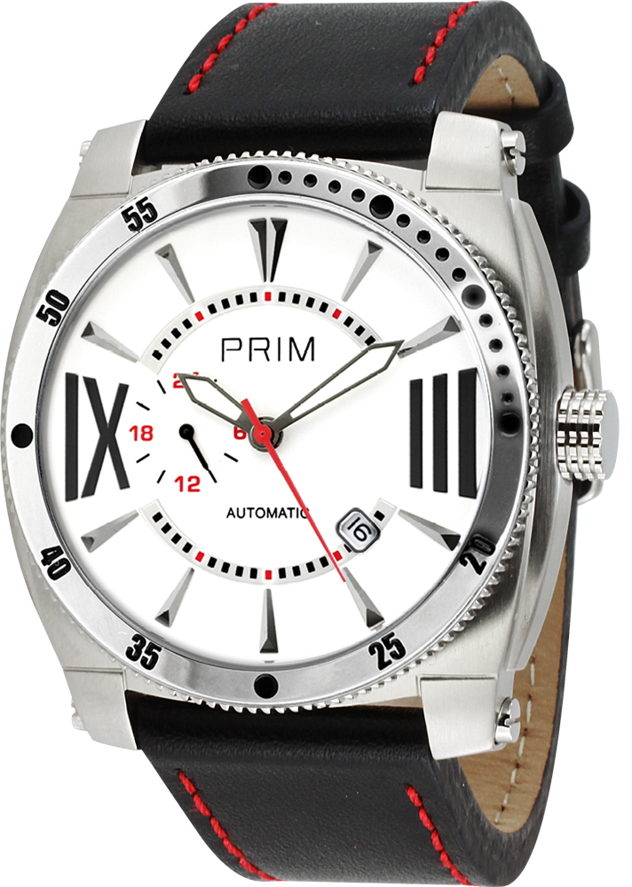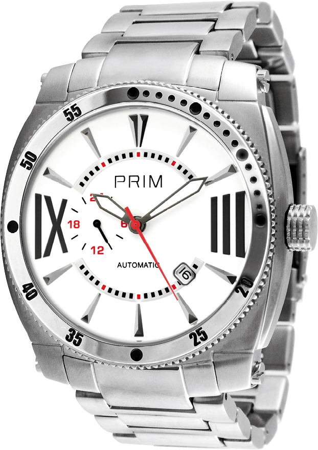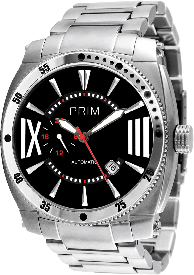 Hranaté pánské hodinky PRIM s automatickým nátahem. Snadno čitelný a moderní ciferník s datumem v masivním pouzdru, který svým sportovním vzhledem zvýrazní pánskou image.