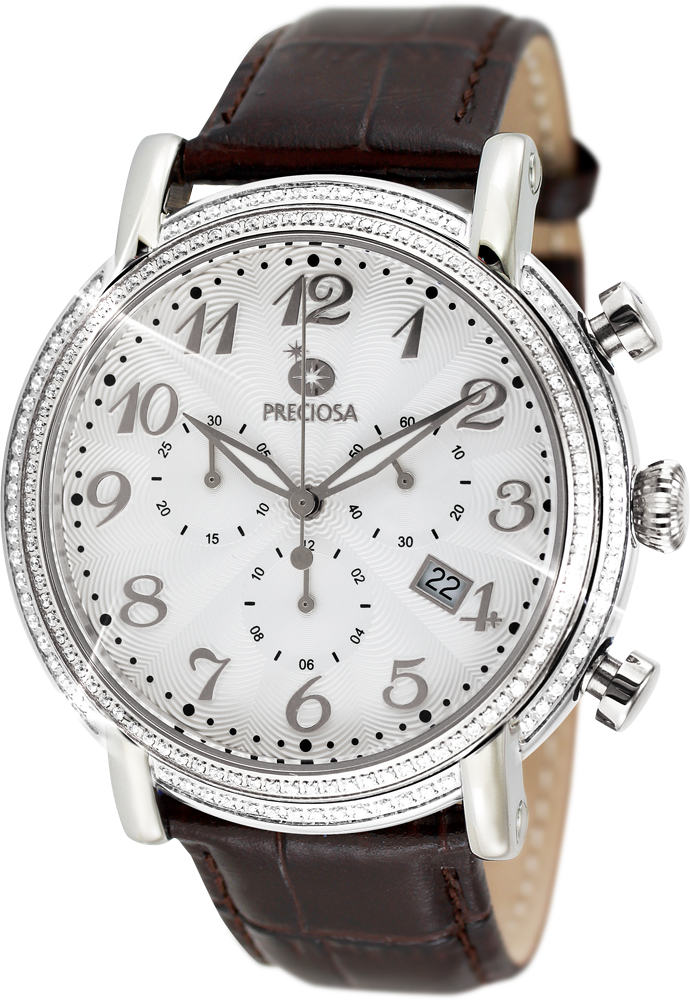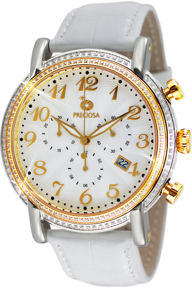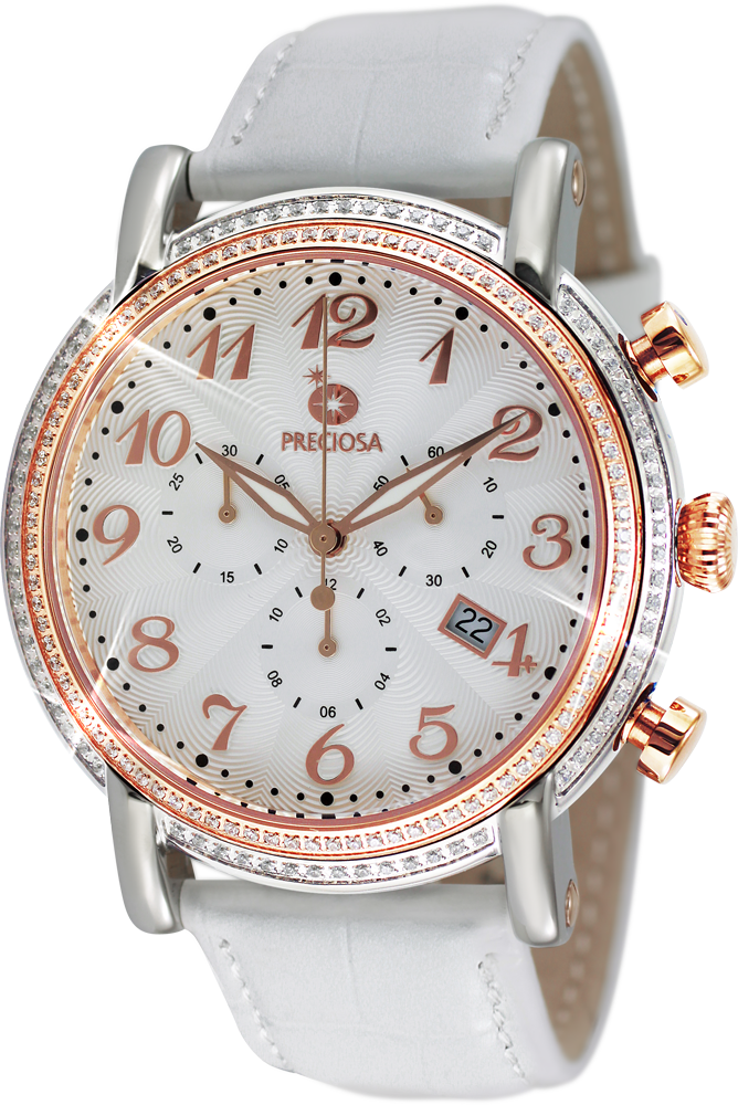 Elegantní dámské hodinky s chronografem a quartzovým strojkem. Dámské hodinky PRECIOSA. Pouzdro je vyrobeno z ušlechtilé oceli 316 L upravené leštěním do vysokého lesku. Zdobení pouzdra kubickou zirkonií PRECIOSA je provedeno CNC technologií, kdy jsou krystaly fasovány do ocelového pouzdra. Řemínek hodinek je vyroben z kvalitní kůže. 5 ATM zaručuje odolnost proti vodě při běžném užívání. Tyto hodinky jsou dodávány v luxusní krabičce se záručním listem a návodem.