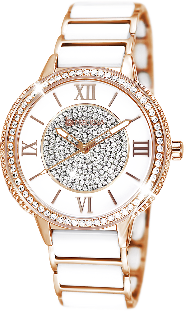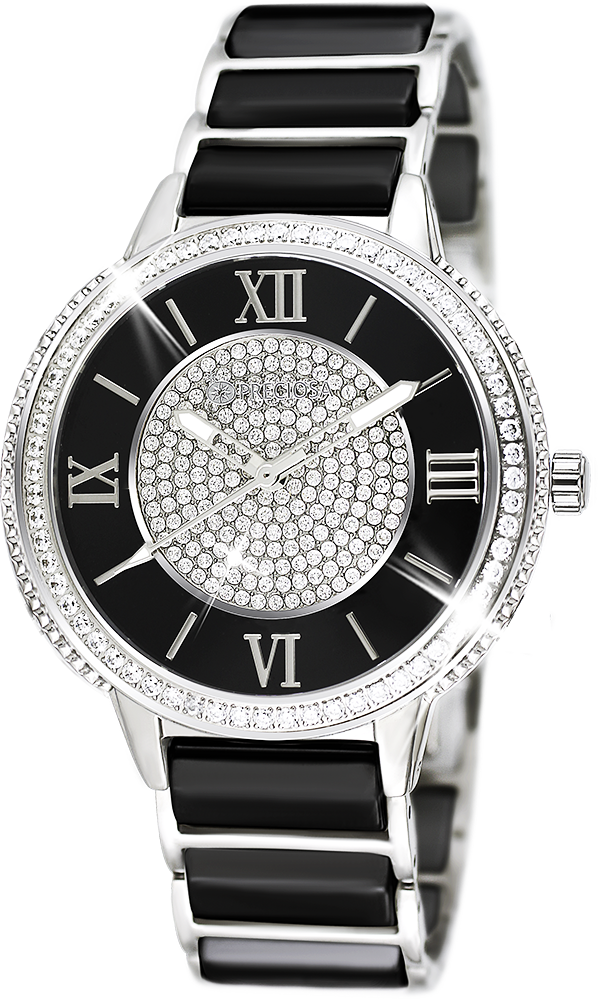 Dámské hodinky PRECIOSA. Pouzdro je vyrobeno z ušlechtilé oceli 316 L upravené leštěním do vysokého lesku. Zdobení pouzdra kubickou zirkonií PRECIOSA je provedeno CNC technologií, kdy jsou krystaly fasovány do ocelového pouzdra. Řemínek hodinek je vyroben z kombinace dvou materiálů, ušlechtilé oceli 316 L a keramiky. Tyto hodinky jsou dodávány v luxusní krabičce se záručním listem a návodem.