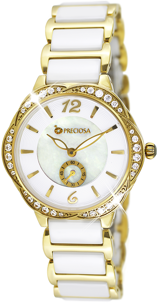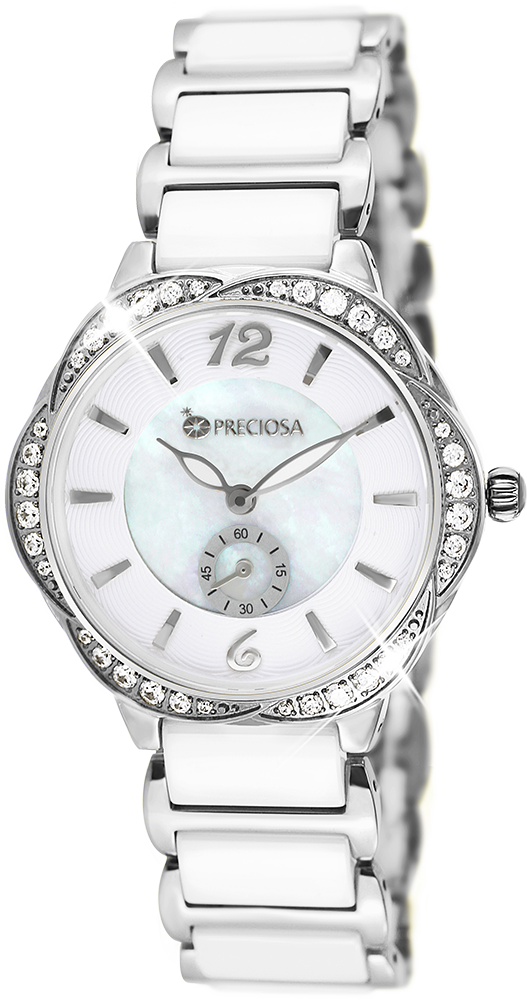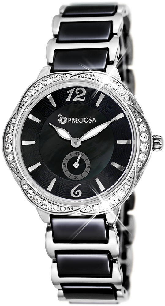 Dámské značkové hodinky PRECIOSA s vteřinovým číselníkem. Pouzdro je vyrobeno z ušlechtilé oceli 316 L upravené leštěním do vysokého lesku. Zdobení pouzdra kubickou zirkonií PRECIOSA je provedeno CNC technologií, kdy jsou krystaly fasovány do ocelového pouzdra ve tvaru květiny. Řemínek hodinek je vyroben z kombinace dvou materiálů, ušlechtilé oceli 316 L a keramiky. 5 ATM zaručuje odolnost proti vodě při běžném užívání.
