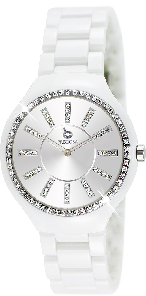 Elegantní dámské hodinky PRECIOSA. Pouzdro a tah hodinek jsou vyrobeny z keramického materiálu, který je velmi odolný proti poškrábání. Na kroužku z ušlechtilé oceli 316L jsou zafasovány krystaly PRECIOSA. Zdobení pouzdra kubickou zirkonií PRECIOSA je provedeno CNC technologií, kdy jsou krystaly fasovány do ocelového kroužku.z kombinace dvou materiálů, ušlechtilé oceli 316 L a keramiky. 5 ATM zaručuje odolnost proti vodě při běžném užívání.