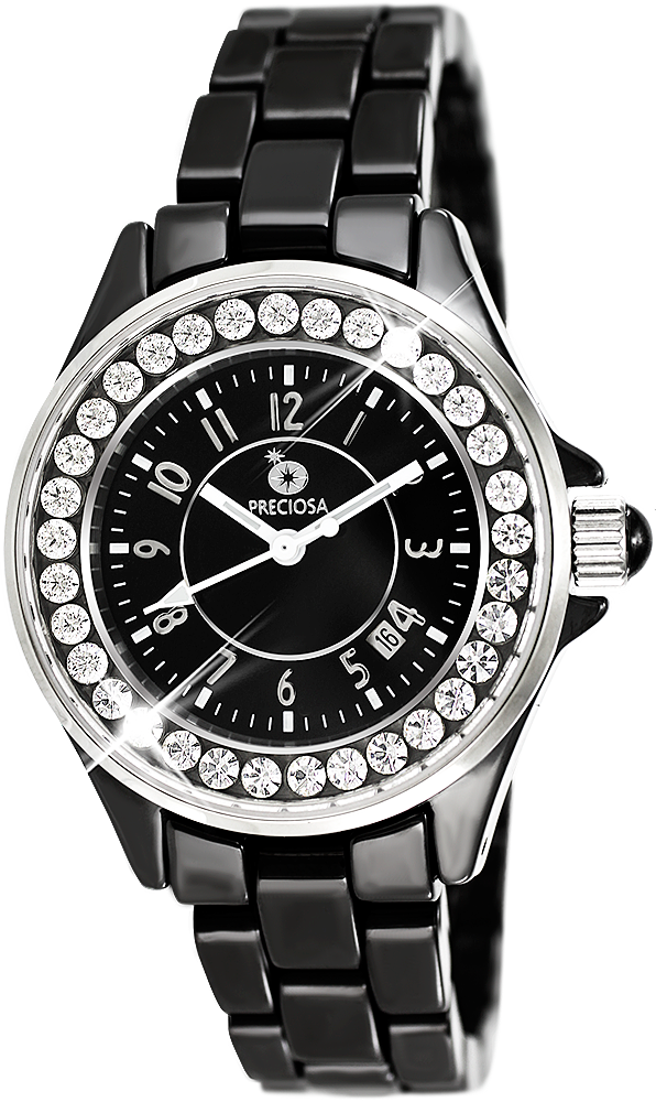 Dámské hodinky PRECIOSA s datumem. Pouzdro a tah jsou vyrobeny z keramického materiálu, který je velmi odolný proti poškrábání. Zdobení obvodu číselníku kubickou zirkonií PRECIOSA je provedeno CNC technologií, kdy jsou krystaly vsazeny do ocelových pouzder. To vše skrývá tvrzené minerální sklíčko hodinek. 5 ATM zaručuje odolnost proti vodě při běžném užívání. Tyto hodinky jsou dodávány v luxusní krabičce se záručním listem a návodem.