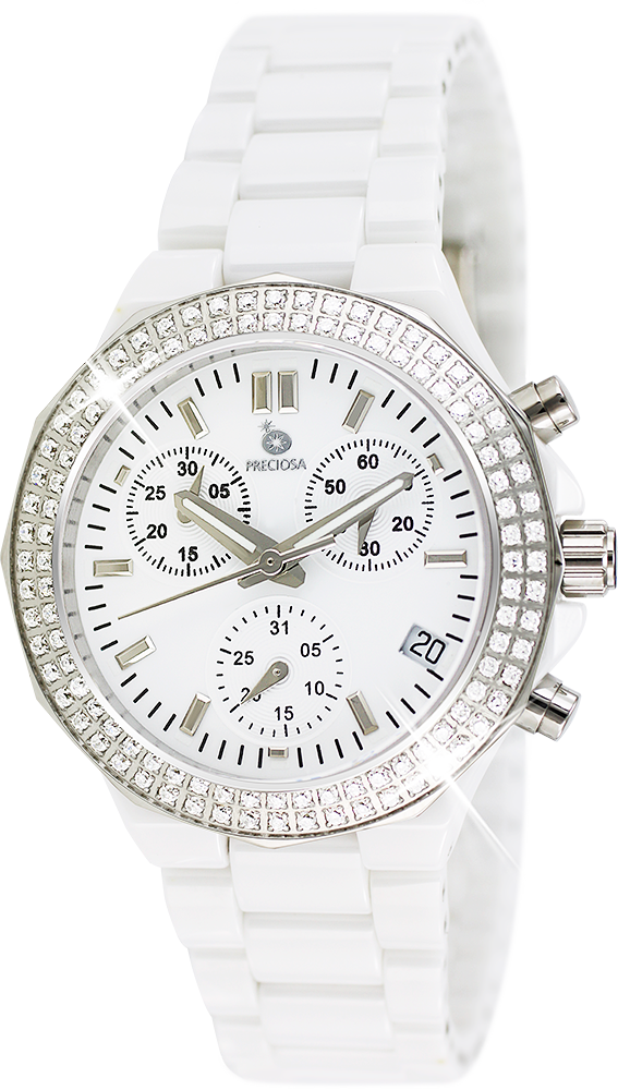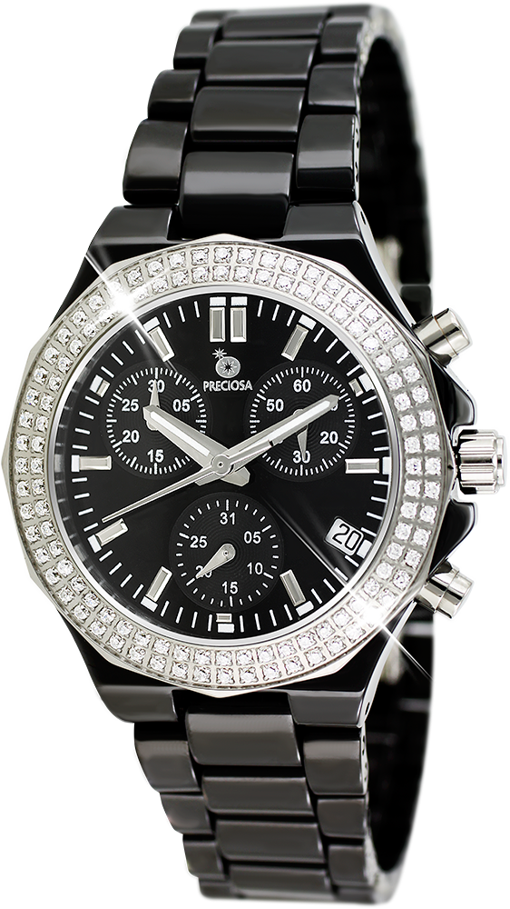 Elegantní hodinky s chronografem a datumem. Pouzdro a tah jsou vyrobeny z keramického materiálu, který je velmi odolný proti poškrábání. Na kroužku z ušlechtilé oceli 316L jsou ve dvou řadách zafasovány krystaly PRECIOSA. Zdobení pouzdra kubickou zirkonií PRECIOSA je provedeno CNC technologií, kdy jsou krystaly fasovány do ocelového kroužku. 5 ATM zaručuje odolnost proti vodě při běžném užívání. Tyto hodinky jsou dodávány v luxusní krabičce se záručním listem a návodem.