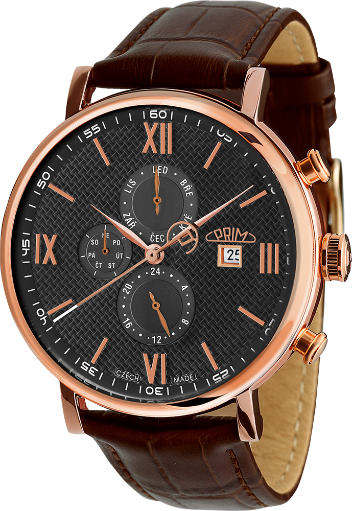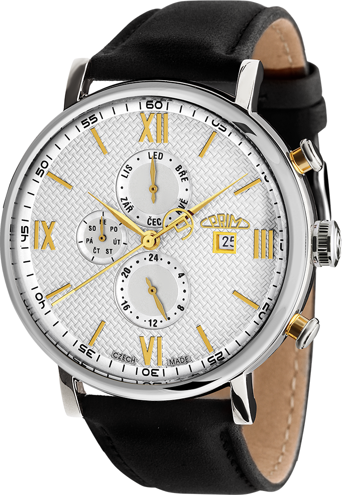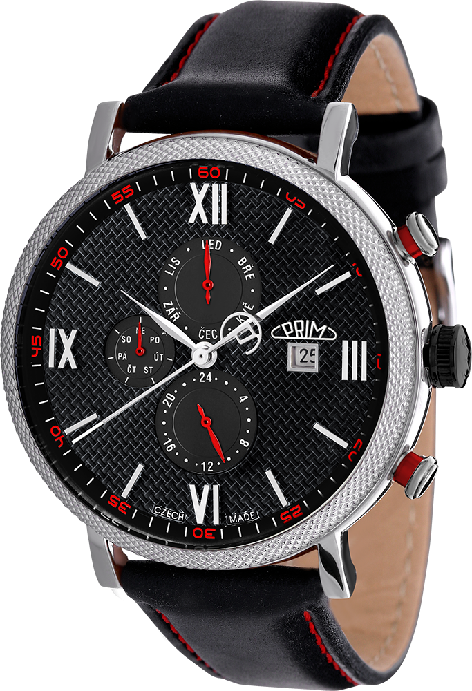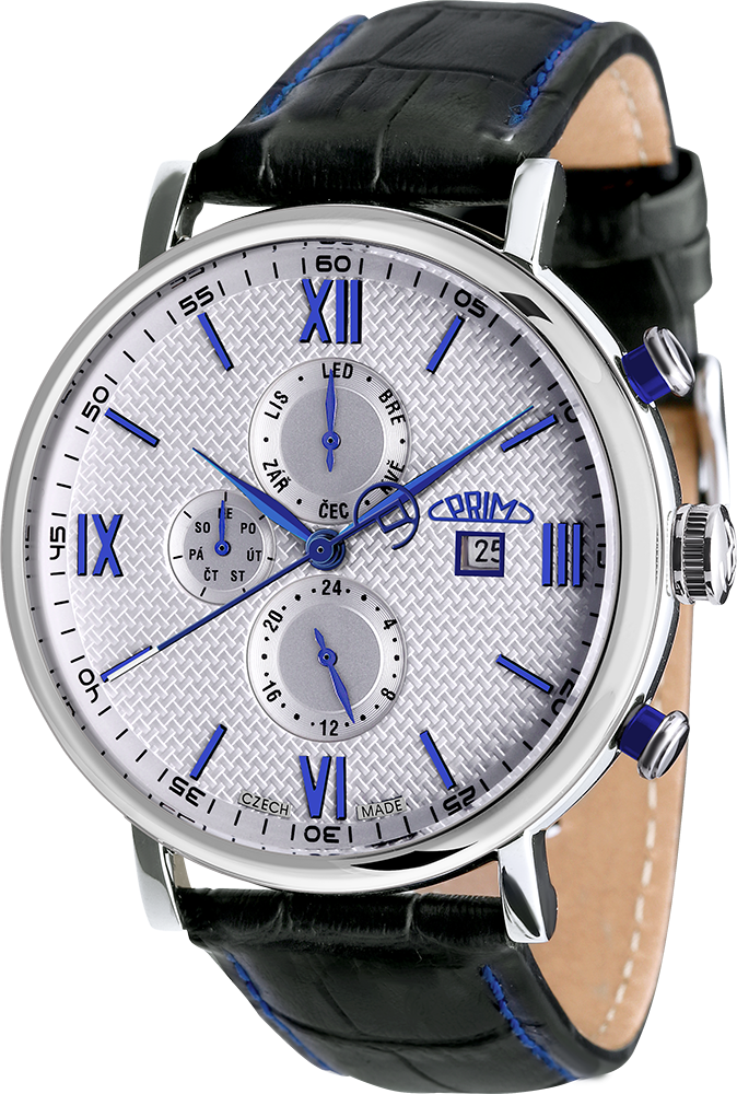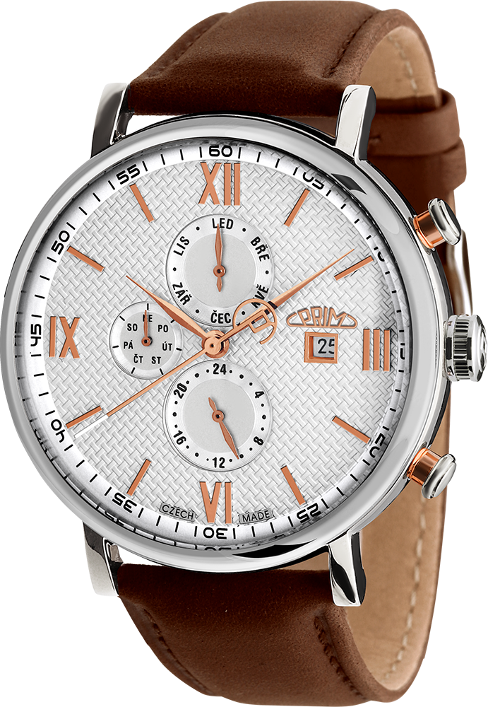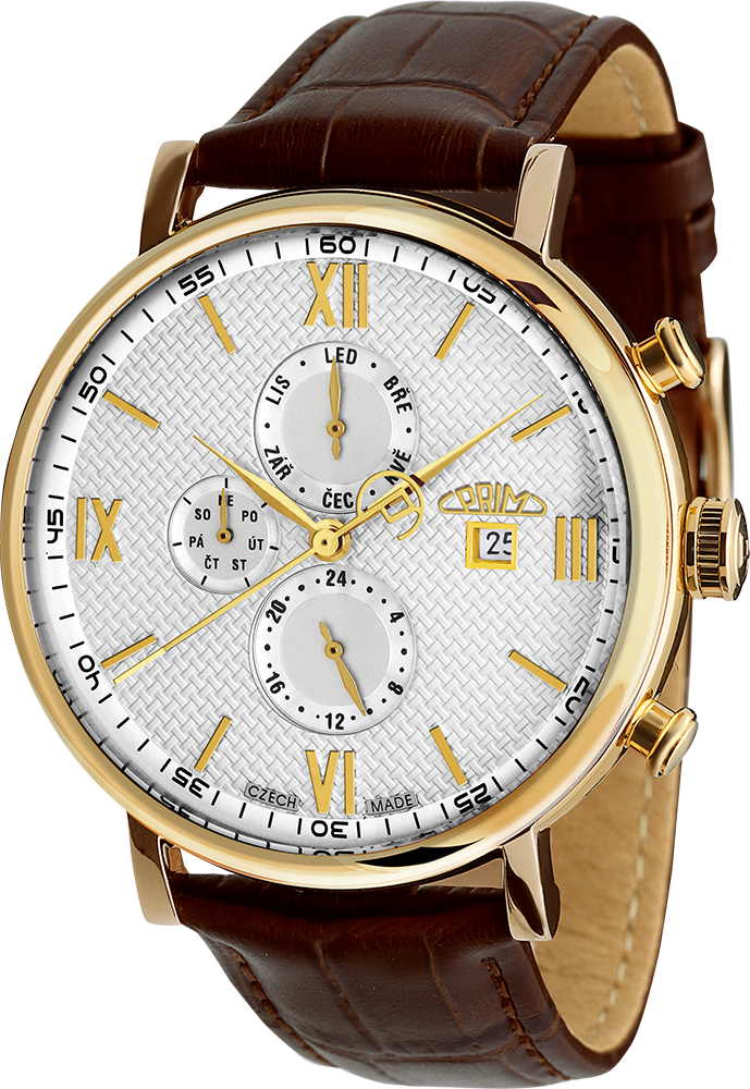 Originální hodinky PRIM Retro Czech 2019 s novým vrstveným a strukturovaným ciferníkem s českými názvy měsíců a dnů. Klasický multifunkční automat je vyroben z