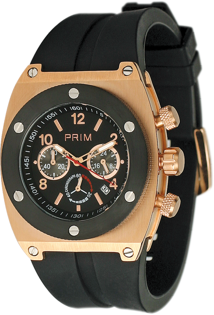 Stylové quartzové pánské hodinky PRIM ve velmi populárním červeno-zlaceném pouzdru v neobvyklém tvaru na gumovém řemínku oslní nejednoho muže.