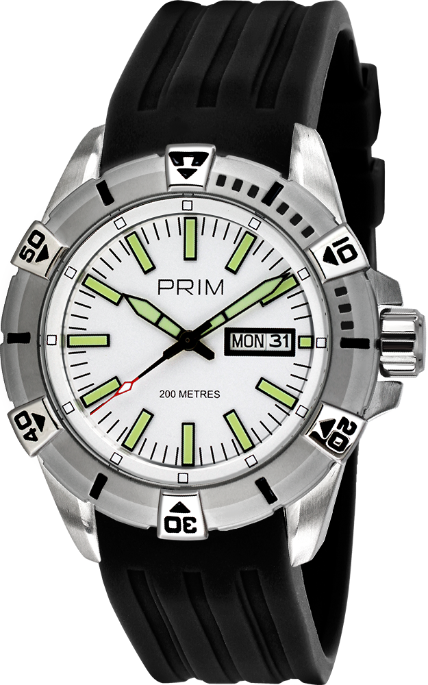 Sportovní hodinky do náročných podmínek z ušlechtilé nerezové oceli 316L. V robustním odolném pouzdře se šroubovací korunkou pracuje quartzový kalibr 2305. Takto dimenzované pouzdro snese tlak vodního sloupce 200 metrů a nese označení 20 ATM. Můžete je používat k pravidelnému plavání nebo k potápění bez kyslíkového přístroje. Otočnou lunetu s jednosměrnou aretací můžete použít k orientačnímu měření času. Pod minerálním sklem je číselník s vystouplými indexy které obsahují luminiscenční vrstvu pro viditelnost i ve tmě, čas ukazují ručky také pokryté luminiscenční vrstvou. Datum s dnem v týdnu je umístěn v okénku na pozici 3 hod. Formovaný silikonový řemínek zakončuje klasická spona na trn z ušlechtilé nerezové oceli. Tyto hodinky jsou dodávány v krabičce se záručním listem a návodem.