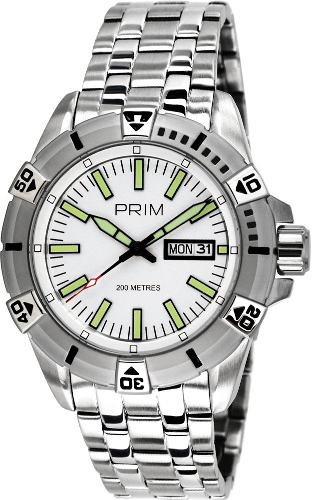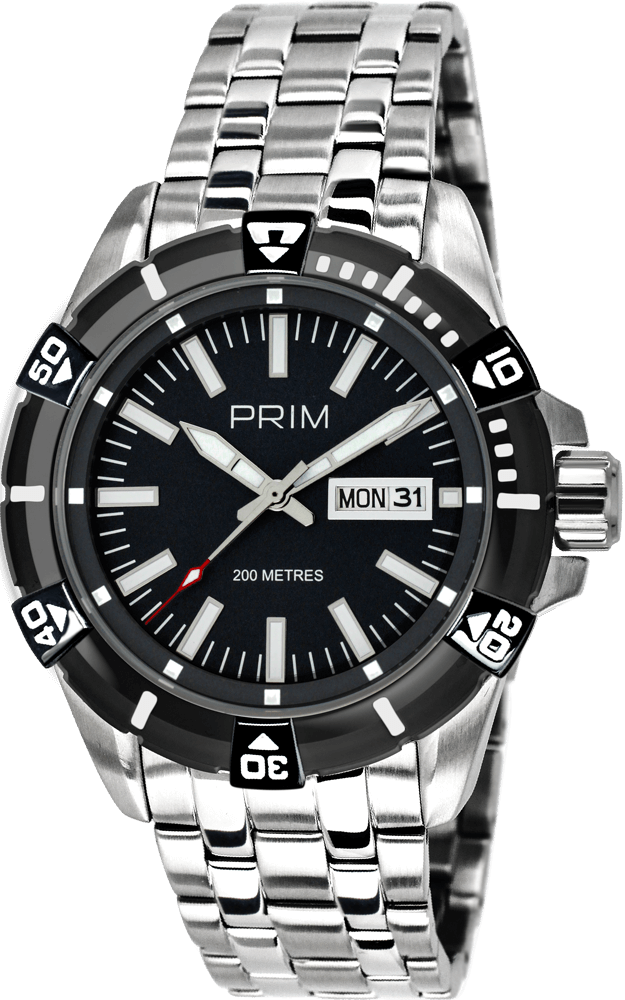 Sportovní hodinky do náročných podmínek z ušlechtilé nerezové oceli 316L. V robustním odolném pouzdře se šroubovací korunkou pracuje quartzový kalibr 2305. Takto dimenzované pouzdro snese tlak vodního sloupce 200 metrů a nese označení 20 ATM. Můžete je používat k pravidelnému plavání nebo k potápění bez kyslíkového přístroje. Otočnou lunetu s jednosměrnou aretací můžete použít k orientačnímu měření času. Pod minerálním sklem je číselník s vystouplými indexy které obsahují luminiscenční vrstvu pro viditelnost i ve tmě, čas ukazují ručky také pokryté luminiscenční vrstvou. Datum s dnem v týdnu je umístěn v okénku na pozici 3 hod. Robustně koncipován je i náramek tvořen z ocelových článků, upraven v kombinaci lesku a matného broušení. Spona s boční pojistkou zamezuje náhodnému odepnutí. Tyto hodinky jsou dodávány v krabičce se záručním listem a návodem.