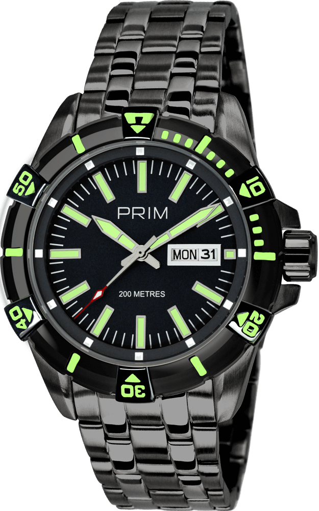 Sportovní hodinky do náročných podmínek z ušlechtilé nerezové oceli 316L. Černá povrchová úprava PVD dává hodinkám moderní osobitý styl. V robustním odolném pouzdře se šroubovací korunkou pracuje quartzový kalibr 2305. Takto dimenzované pouzdro snese tlak vodního sloupce 200 metrů a nese označení 20 ATM. Můžete je používat k pravidelnému plavání nebo k potápění bez kyslíkového přístroje. Otočnou lunetu s jednosměrnou aretací můžete použít k orientačnímu měření času. Pod minerálním sklem je číselník s vystouplými indexy které obsahují luminiscenční vrstvu pro viditelnost i ve tmě, čas ukazují ručky také pokryté luminiscenční vrstvou. Datum s dnem v týdnu je umístěn v okénku na pozici 3 hod. Robustně koncipován je i náramek tvořen z ocelových článků, upraven v kombinaci lesku a matného broušení. Spona s boční pojistkou zamezuje náhodnému odepnutí. Tyto hodinky jsou dodávány v krabičce se záručním listem a návodem.