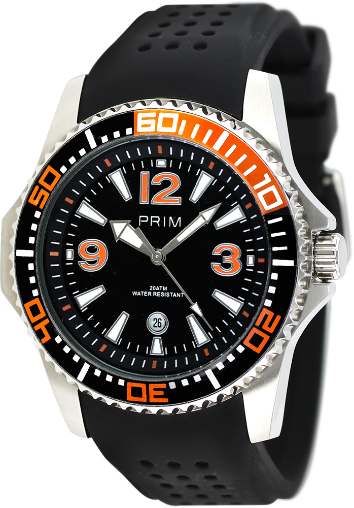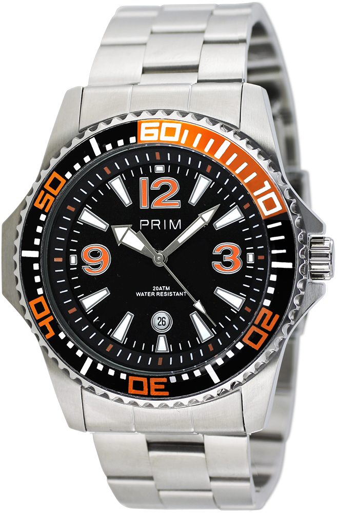 Pánské sportovní hodinky s klasickým černým číselníkem osazeným výraznými reliéfními indexy v nerezovém pouzdře s černooranžovým kroužkem. Pouzdro těchto sportovních hodinek je upraveno leštěním, jež dodává hodinkám ten správný lesklý vzhled. Sportovní styl doplňuje i otočná luneta se stupnicí minut a s jednosměrnou aretací. Jistotu, že tyto hodinky budou sloužit dlouhá léta, Vám dává jejich kvalitní provedení ze špičkové ušlechtilé oceli, bezpečné minerální sklo a osvědčený quartzový strojek kalibru 2115. Díky dnu pouzdra na závit je tento model vhodný i pro základní potápění (voděodolnost 20 ATM). Hodinky na ruce drží robustní tah z ušlechtilé nerezové oceli 316L zakončen překlápěcí sponou s dvojitou pojistkou. Tyto sportovní hodinky jsou dodávány spolu se záručním listem v luxusní krabičce.  Navíc jsme pro Vás připravili celou řadu modelů v různých variacích barev a typů řemínků - prohlédněte si i je, určitě si vyberete.