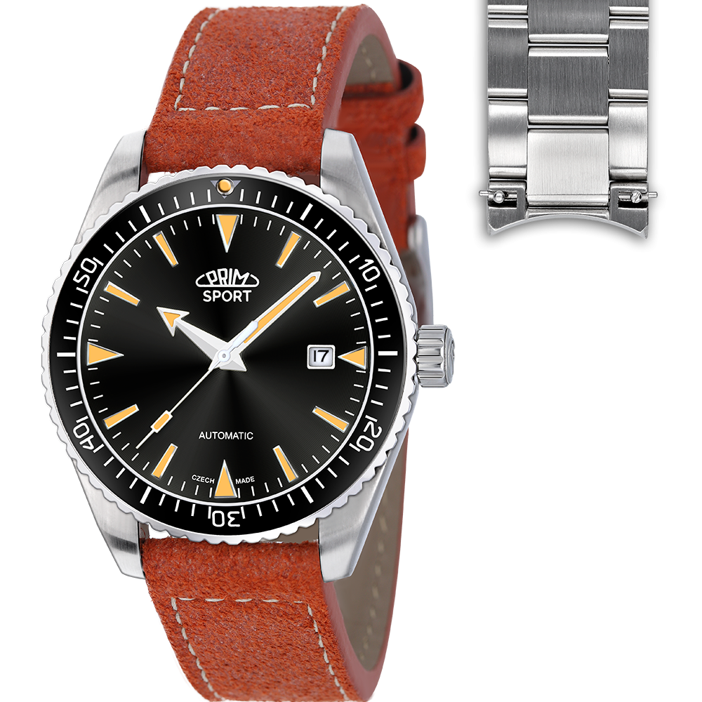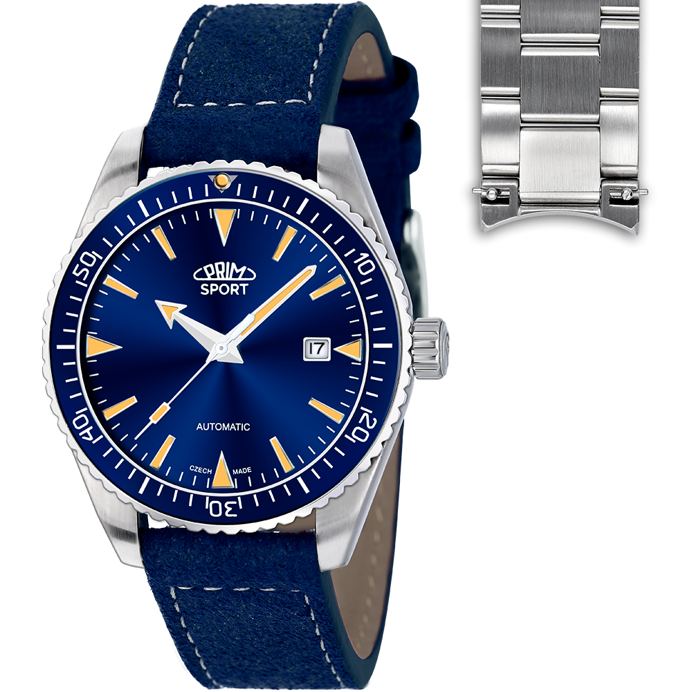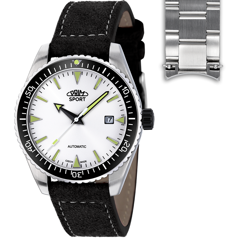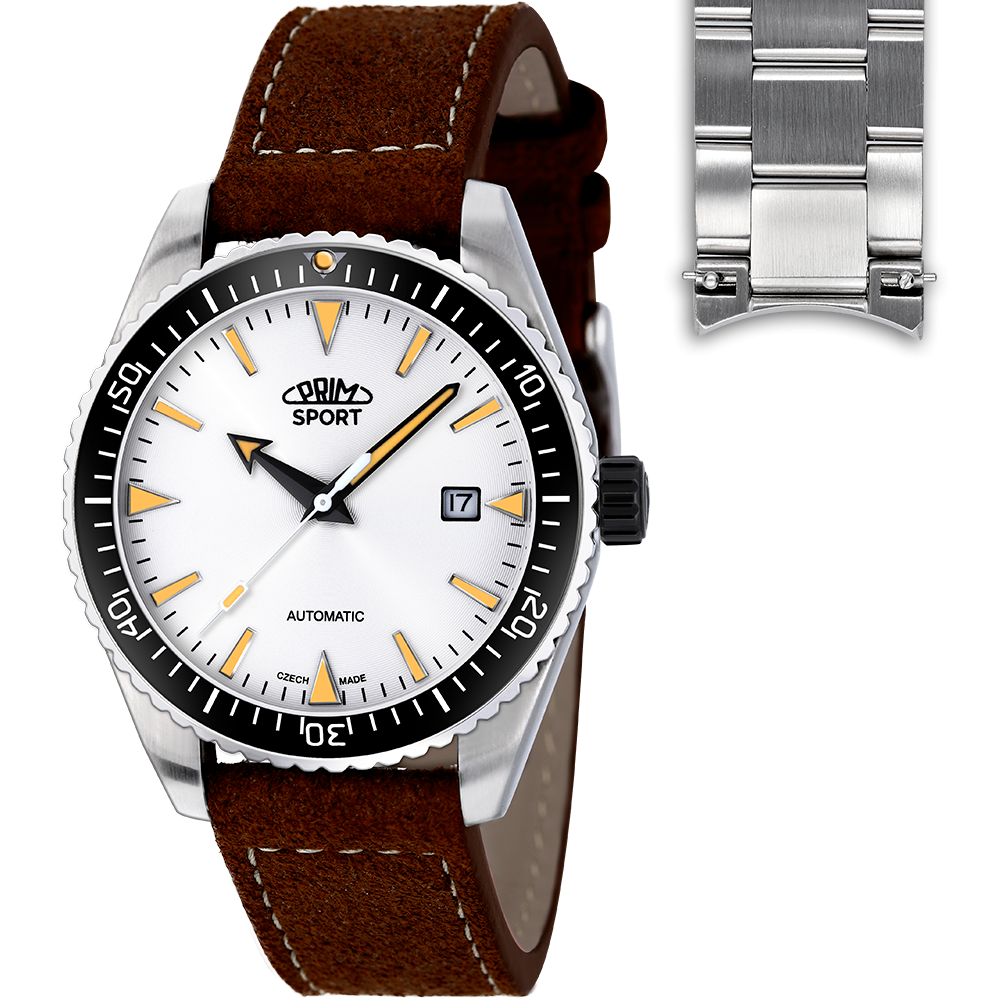 Nová edice úspěšného modelu PRIM Sport Legenda Automatic v sadě s impregnovaným koženým a nerezovým řemínkem. Sportovní hodinky by nebyly sportovní bez většího označení voděodolnosti, to model PRIM SPORT Legenda splňuje na jedničku, a to díky 10 ATM, které zaručuje vysokou odolnost a kvalitu.