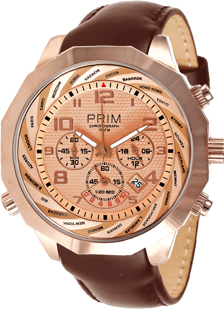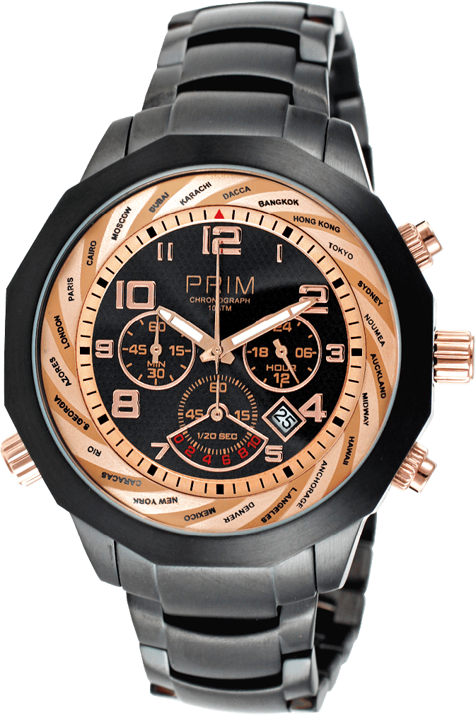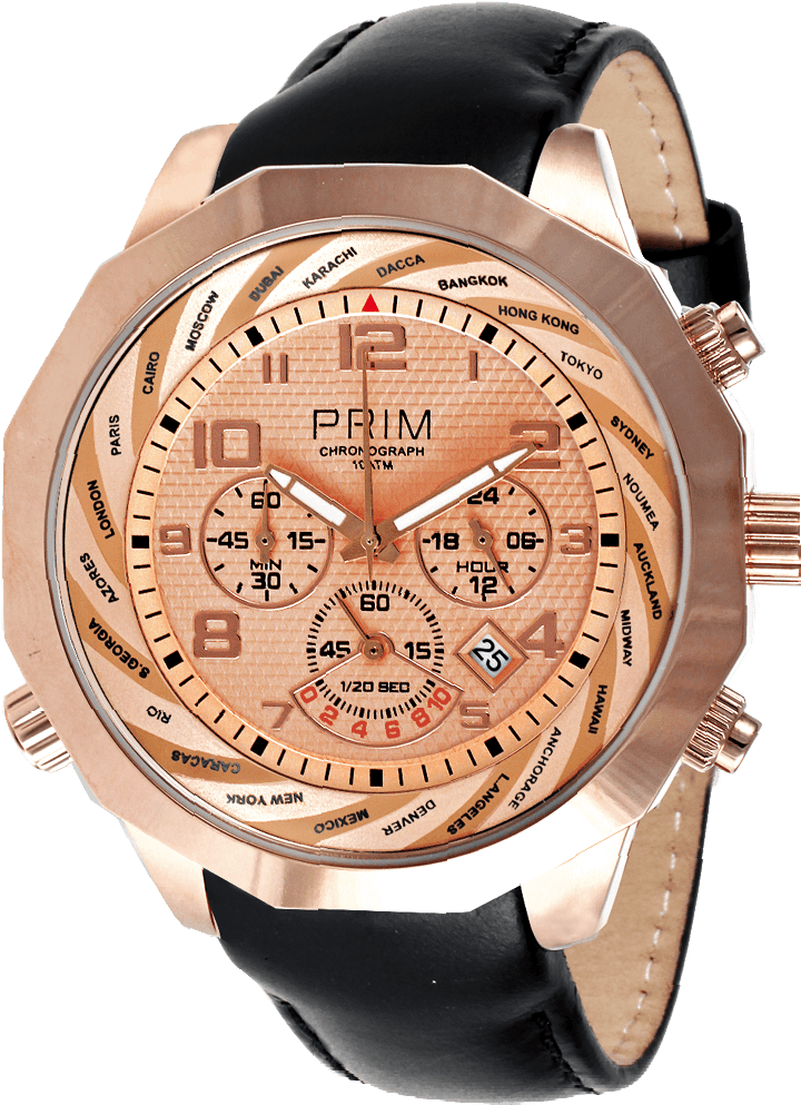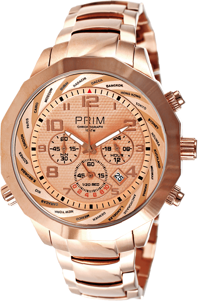 Multifunkční chronograf vyroben z leštěné ušlechtilé nerezové oceli 316 L upravené technologií IPGR. Tato vysoce otěru odolná úprava dává pouzdru odstín růžového zlacení. Do masivního pouzdra s průměrem 47 mm je vsazen quartzový strojek s chronografem kalibr OS 22 s měřením na 1/20 sekundy. Hodinky mají dno z ušlechtilé nerezové oceli uzavřené na závit. Vodotěsnost 10 ATM zaručuje odolnost proti vodě při plavání. Pod konvexním minerálním sklíčkem je reliéfní číselník s vystouplými arabskými čísly a na jeho kroužku je zobrazena minutová stupnice. Číselník má také okénko na pozici 4:30 hod ve kterém je umístěn datum. Kroužek s časovými pásmy nacházející se vně číselníku je ovládán korunkou na pozici 8 hod. Hlavní hodinová a minutová ručka jsou pokryty luminiscenční vrstvou a ručky chronografu jsou zlacené. Náramek je upraven kartáčováním a leštěním rovněž vyroben z ušlechtilé oceli 316 upraven technologií IPGR, se zapínáním sponou s dvojitou pojistkou.