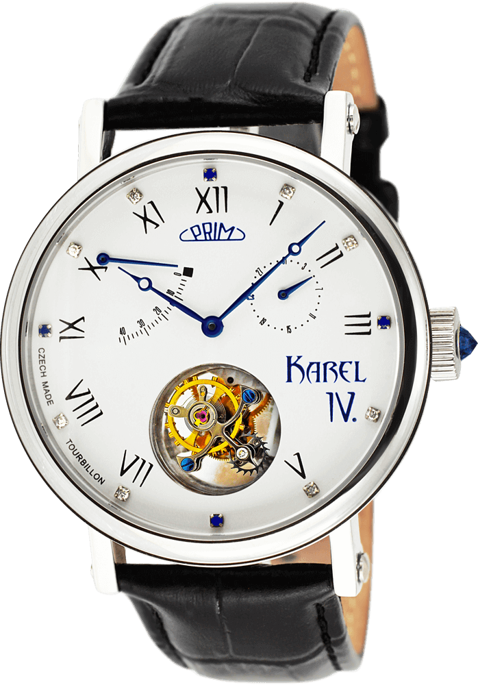 Hodinky z kolekce PRIM Karel IV. jsou vyrobeny z ušlechtilé oceli upravené leštěním do vysokého lesku. Výrazným prvkem pouzdra je stylové vroubkování po celém obvodu. Číselník s průzorem odkrývá mechanický strojek s královskou hodinářskou komplikací zvanou tourbillon. Ten rotuje na pozici 6 hodin, zároveň plnící funkci sekundové ručky. Smaltovaný číselník s tištěnými římskými čísly a reliéfními indexy s diamanty, safíry, vytváří netradiční luxusní kombinace. Safír najdete také vsazen do korunky. Na pozici 2 hodiny v kruhovém čítači je umístěn datum. Jednou z předností tohoto mechanického modelu je i ručkou znázorněná rezerva nátahu, to je doba chodu strojku než se zastaví. Hodinky jsou vybaveny safírovým sklem, které je vysoce odolné proti poškrábání. Celý mechanismus je uzavřen dnem s průzorem z minerálního skla, po jehož obvodu je uvedena stručná charakteristika modelu spolu s výrobním číslem.