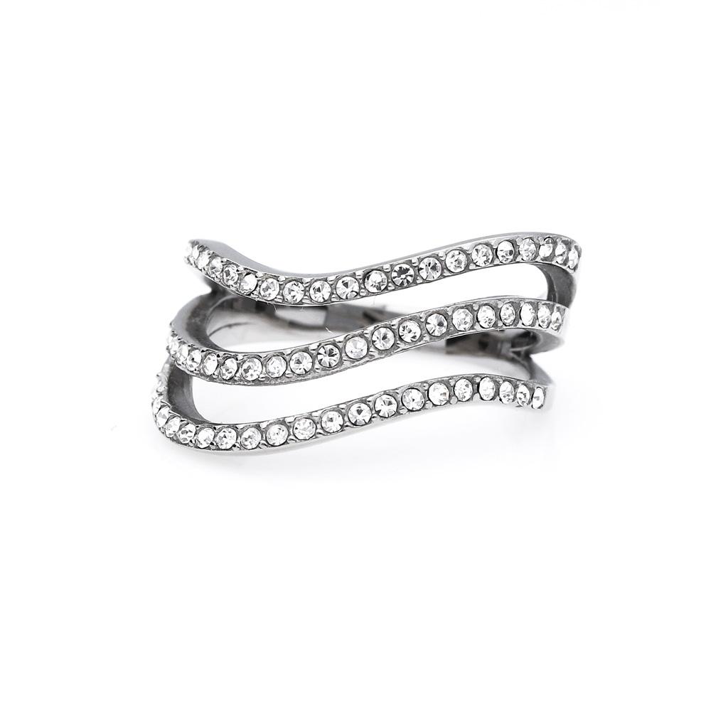 Stylový a elegantní prsten z chirurgické oceli. Moderní trojité propletení s zirkony zaujme na každé dámské ruce.