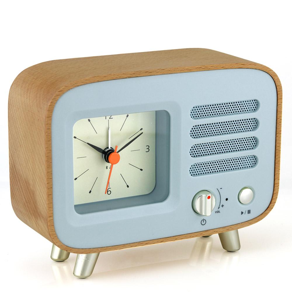 Dřevěný analogový budík s nerezovými doplňky v retro designu s bluetooth reproduktorem a možností přehrávání hudby z mobilního telefonu nebo microSD karty.